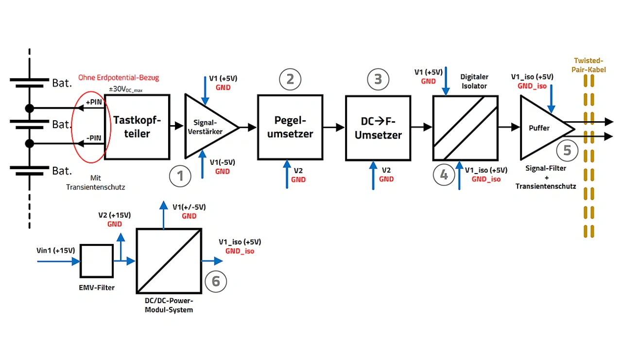 4. Digitaler Isolator: Galvanische Trennung zwischen Messpotenzial und Schnittstelle.