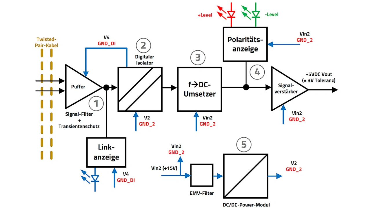 2. Digitaler Isolator: Galvanische Trennung zwischen Eingangssignal und sekundärer Signalaufbereitung / Ausgangsschnittstelle. Zusätzlich galvanisch isolierte Spannung für den eingangsseitigen Puffer.