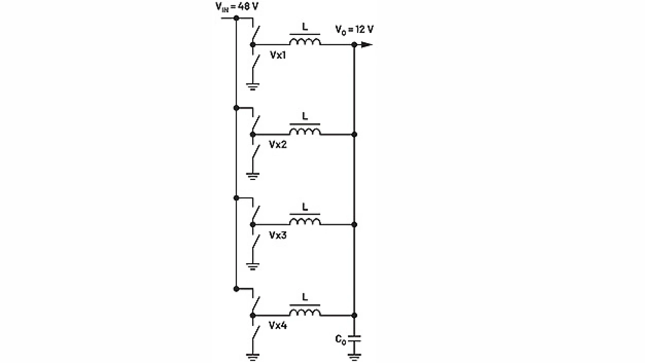 Die 48-V-Stromverteilung wird typischerweise auf eine Zwischenspannung, häufig 12 V oder weniger, umgewandelt. Dann liefern die verschiedenen lokalen POL-Regler (Point of Load) eine Vielzahl unterschiedlicher Spannungen direkt an die verschiedenen Lasten. Eine der ersten Möglichkeiten für den Abwärtsspannungsregler von 48 V auf 12 V ist ein mehrphasiger Abwärtswandler (Bild 1). Dies ist eine Lösung mit geregelter VO und einem schnellen Einschwingverhalten, die sich auch noch einfach und kostengünstig realisieren lässt. Für einen Leistungsbereich von einigen hundert Watt bis über 1 kW können vier parallele Phasen in Betracht gezogen werden.