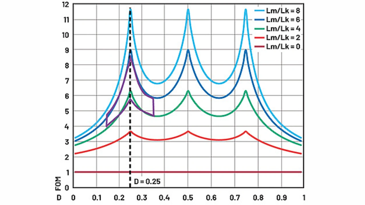 Der erste Schritt zur Verbesserung wäre die grafische Darstellung der FOM für Nph = 4 für mehrere praktisch sinnvolle Werte des Kopplungskoeffizienten Lm/Lk (Bild 2). Die rote Kurve in Bild 2 (Lm/Lk = 0) repräsentiert die Basislinie FOM = 1 für die diskrete Induktivität. Es wurde gezeigt, dass die NCL-Strukturen (Notch CL) mit sehr geringen Leckströmen im Allgemeinen sehr hohe Lm/Lk-Werte und damit hohe FOM-Werte erreichen können [8,9]. Da die interessierende Einschaltdauer idealerweise genau in der ersten Kerbe D = 12 V/48 V = 0,25 liegt, ist es notwendig, einen gewissen Bereich für VIN und VO zu berücksichtigen. Manchmal kann die Nennspannung VIN 48 V oder 54 V plus eine gewisse Toleranz betragen. VO kann von 12 V abweichen und so weiter.