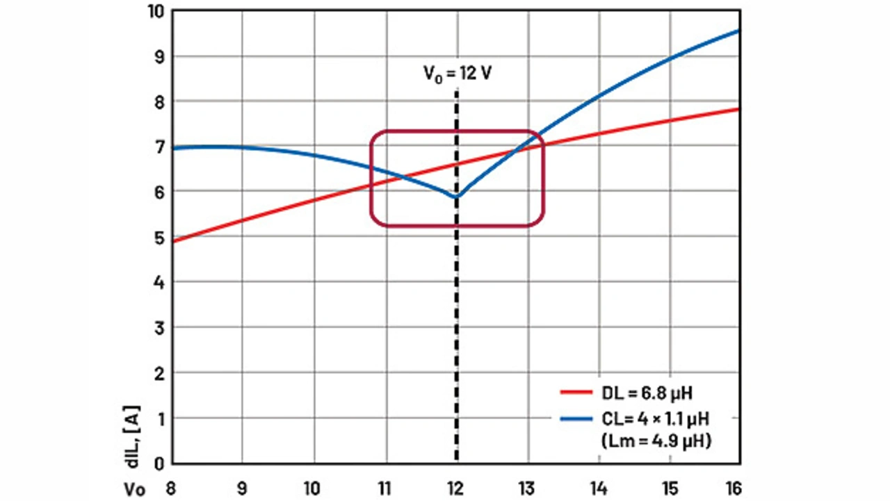 Bild 3 zeigt die entsprechende Stromwelligkeit. Dabei wird das Basisdesign DL = 6,8 μH mit dem vorgeschlagenen vierphasigen CL = 4 × 1,1 μH (Lm = 4,9 μH) bei VIN = 48 V und FS = 200 kHz verglichen. In dem hier interessierenden Bereich ist die Stromwelligkeit von CL ähnlich oder kleiner als die von DL. Dies bedeutet, dass alle Schaltkreis-Stromverläufe einen ähnlichen Effektivwert aufweisen, was auch für die Leitungsverluste gilt. Dieselbe Welligkeit bei der gleichen Frequenz FS bedeutet auch dieselben Schaltverluste und Gate-Treiberverluste usw.