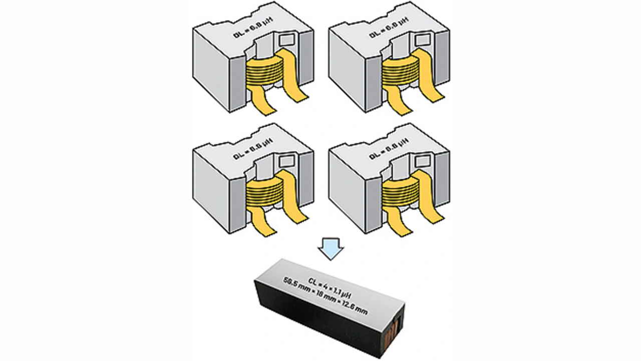 Bild 4 zeigt vier diskrete Induktivitäten (DL) mit jeweils 6,8 μH, die durch eine CL mit 1,1 μH ersetzt werden [5]. Jede diskrete Induktivität (DL) ist 28 mm × 28 mm × 16 mm groß. Geht man davon aus, dass sie im Abstand von 0,5 mm angeordnet sind, ergibt eine vierphasige gekoppelte Induktivität (CL) mit den Abmessungen 56,5 mm × 18 mm × 12,6 mm eine 4-fache Verkleinerung des Bauvolumens.
