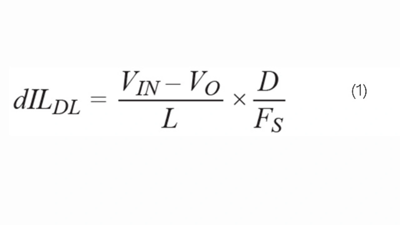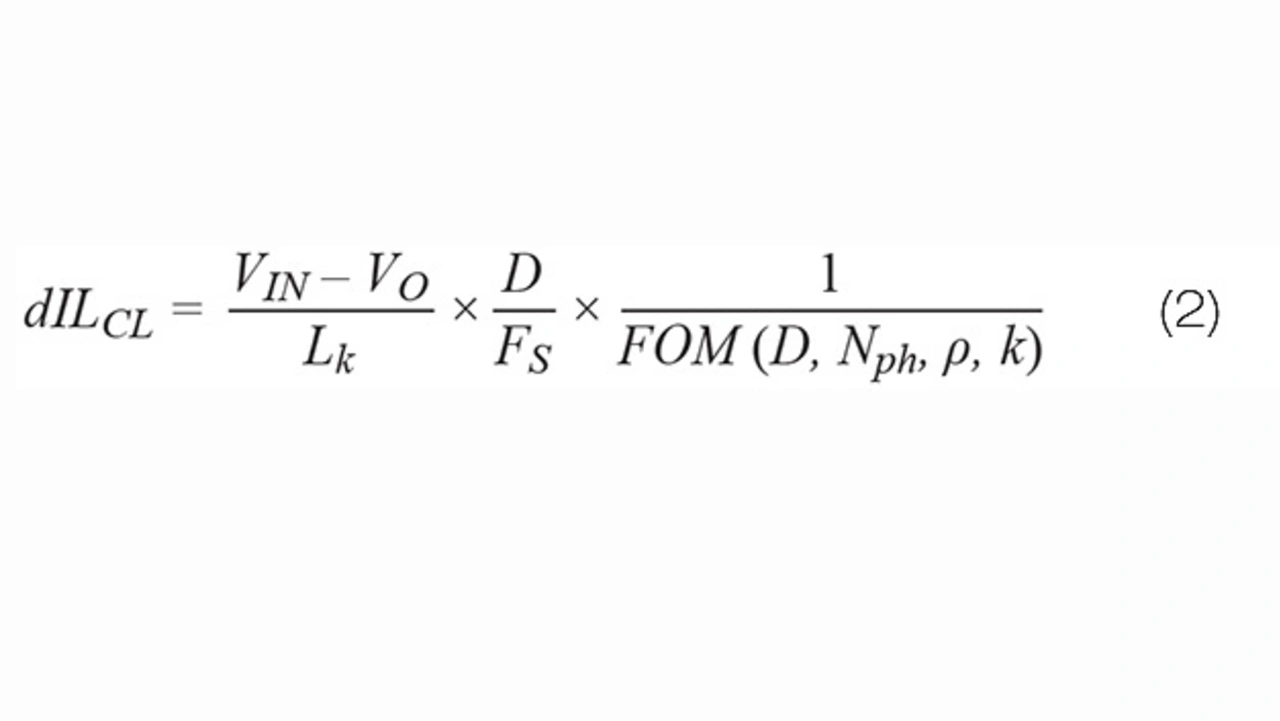 Die Stromwelligkeit in jeder Phase des herkömmlichen Abwärtswandlers lässt sich mit Gleichung 1 ermitteln. Darin sind D die Einschaltdauer, VO die Ausgangsspannung, VIN die Eingangsspannung, L der Induktivitätswert und FS die Schaltfrequenz.