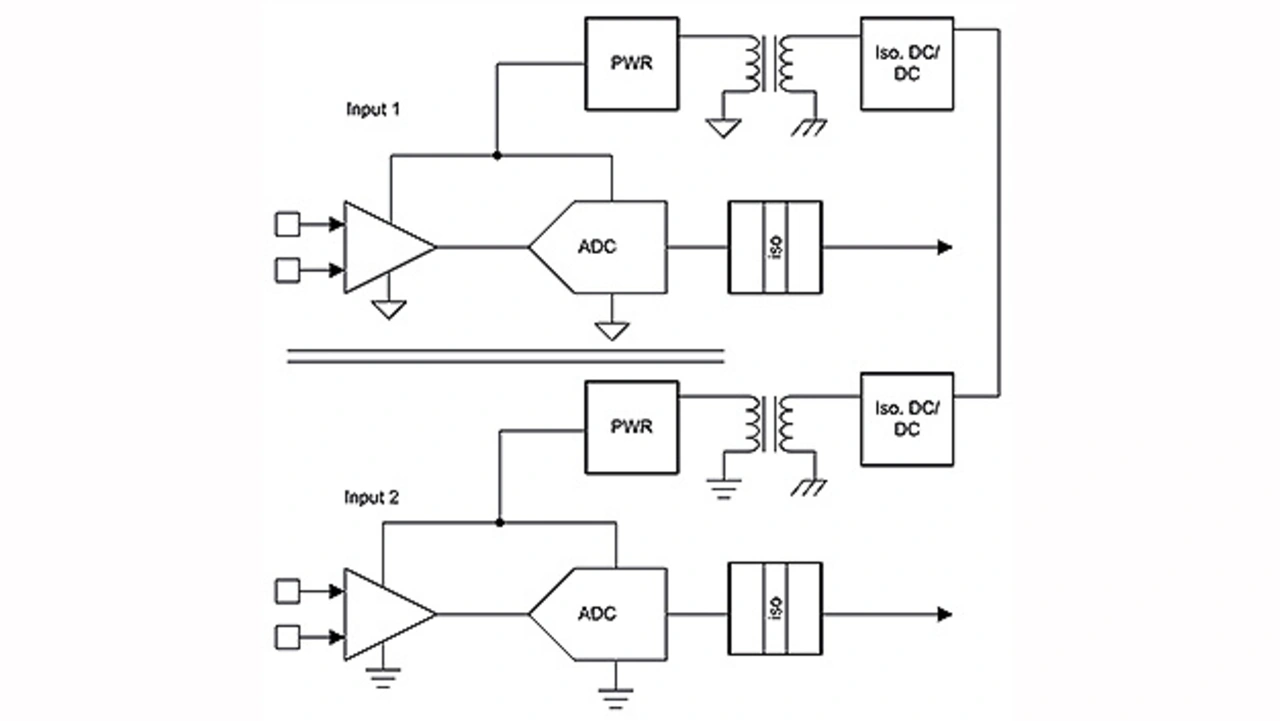 Die ADCs sind dann über digitale Si- gnalisolatoren mit der Verarbeitungseinheit verbunden, und auch die Stromversorgung für das analoge Frontend und den ADC ist isoliert. Digitalisolatoren wie der ISO6742 von Texas Instruments kommen auf eine Isolationsspannung von 5 kV (eff.), also auf deutlich mehr als typische Übertrager. Ist die für einen Kanal benötigte Leistung kleiner als 500 mW, kann ein integrierter Stromversorgungs- und Daten-Isolator wie der ISOW7741 dafür sorgen, dass Platz und Kosten gespart werden. Die Topologie mit einzeln isolierten Kanälen ist am teuersten, benötigt den meisten Platz und verbraucht am meisten Strom. Im Gegenzug bietet sie aber den größten Gleichtaktbereich und liegt auch in Sachen Leistungsfähigkeit und Zuverlässigkeit an der Spitze