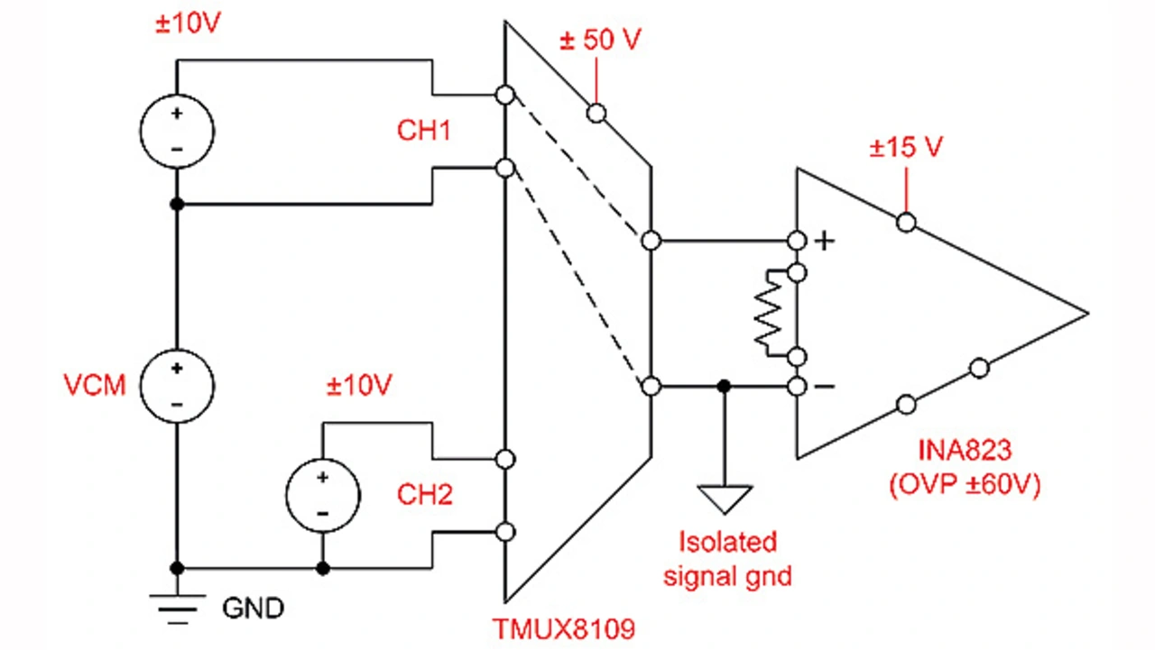 Der für 100 V ausgelegte, differenzielle 4-auf-12-Multiplexer TMUX8109 (Bild 3) beispielsweise unterstützt eine Gleichtaktspannungs-Differenz von 80 V und ein typisches differenzielles Eingangssignal von ±10 V. Wird er mit einem gegen Überspannungen geschützten Verstärker wie dem INA823 kombiniert, sind externe Schutzdioden überflüssig.