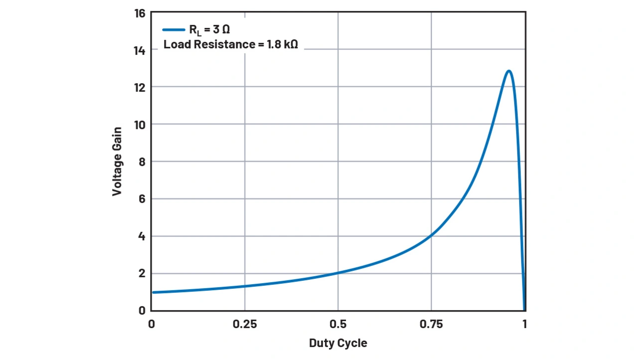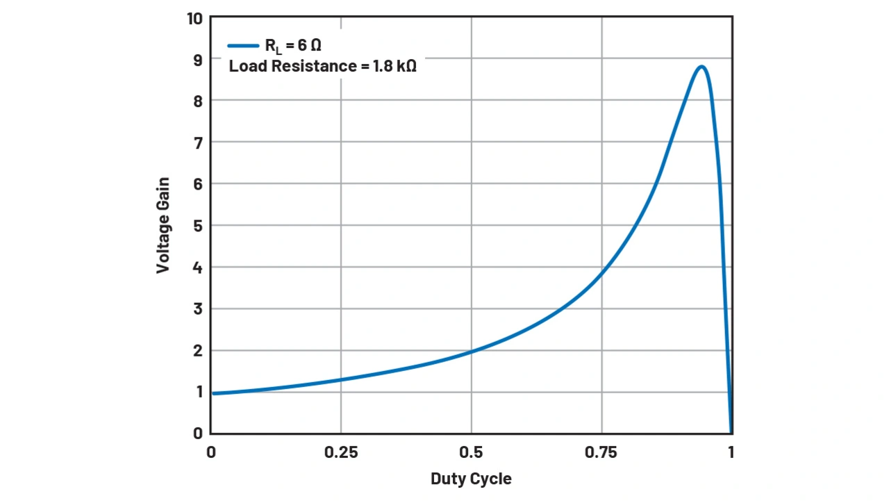Bild 3 zeigt die Kurve des Boost-Faktors, wenn das Verhältnis zwischen Last- und Spulenwiderstand 300 beträgt. Hier wurde RL von 6 Ω und ein Lastwiderstand von 1,8 kΩ ausgewählt. Zu erkennen ist, dass der maximale Boost-Faktor in diesem Fall nur bei maximal 9 liegt. Somit wäre ein Wandeln der Eingangsspannung von 24 V nach 300 V unmöglich. Der RL, also der DCR der Spule, wurde zu groß ausgewählt.