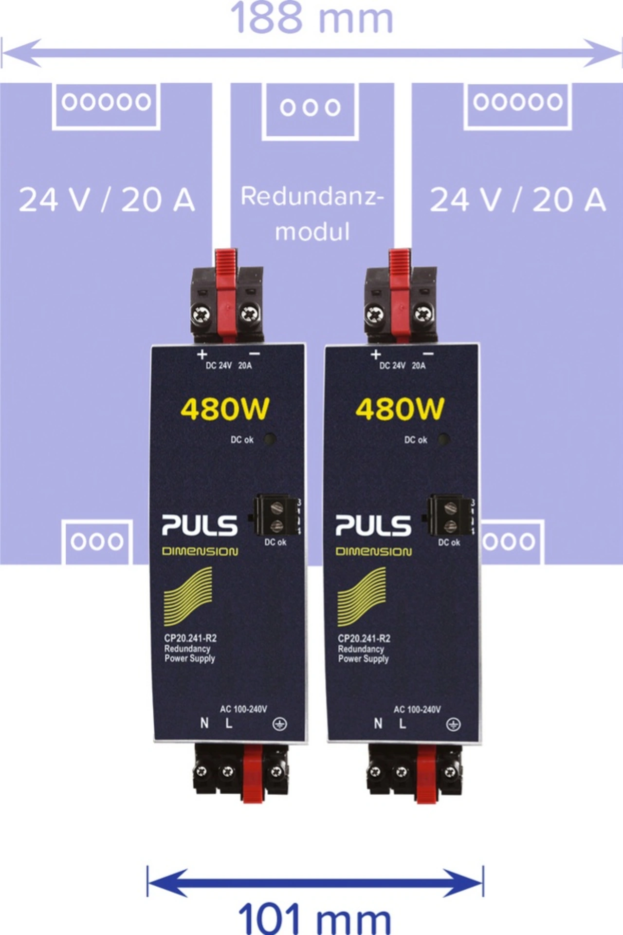 Dabei ist es gelungen, die Entkopplungsfunktion in die Gehäuse der Netzteile mit 24 V und 10 A (CP10) sowie der 24-V-/20-A-Versionen zu integrieren. Auf die Baubreite der Standardgeräte CP10 (39 mm) und CP20 (48 mm) hat das keinen Einfluss. Durch das schlanke Gerätedesign und den Wegfall des externen Redundanzmoduls ist eine Platzersparnis von mehr als 45 Prozent (Bild 2) gegenüber herkömmlichen Redundanzsystemen mit einer identischen Funktionalität möglich. Auch in Sachen Wirkungsgrad übernehmen die Stromversorgungen mit bis zu 95,2 Prozent die hohen Werte der Ursprung-CPs.