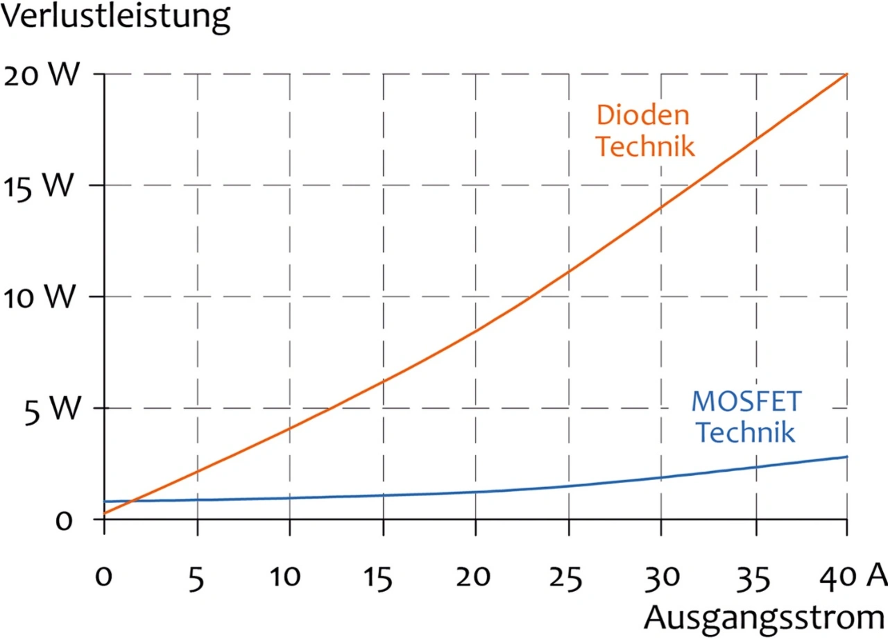 Eine Entkopplung mit möglichst geringer Verlustleistung lässt sich mit den üblichen Dioden nicht erreichen. Für einen effizienten Ansatz sollte deshalb auf die Entkoppelung mittels MOSFETS gesetzt werden. Bei einem Laststrom von 40 A im Redundanzmodul mit MOSFET-Technologie entstehen beispielsweise nur noch Verluste in Höhe von 3 W. Bei dem Dioden-Redundanzmodul hingegen betragen die Verluste unter den gleichen Bedingungen 20 W, wie Bild 3 zeigt.