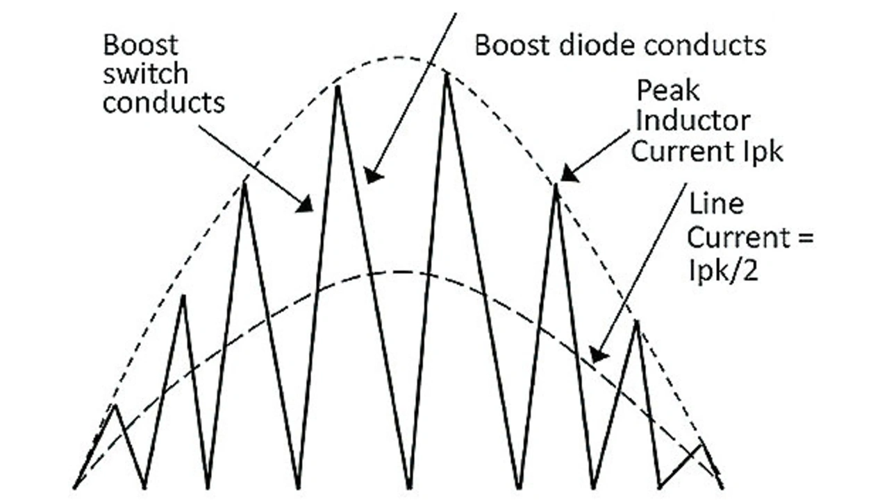 Der CrCM kann einen höheren Wirkungsgrad in Designs bis zu einigen hundert Watt bieten. Dabei werden Änderungen der Netzspannung und des Laststroms überwacht, und die Schaltfrequenz variiert, um an dem Betriebspunkt exakt zwischen CCM und DCM zu arbeiten. Der CrCM hat geringe Einschaltverluste und begrenzt den Spitzenstrom auf das Doppelte des Durchschnittsstroms, sodass die Kupfer- und Kernverluste auf einem vernünftigen Niveau bleiben (Bild 2).