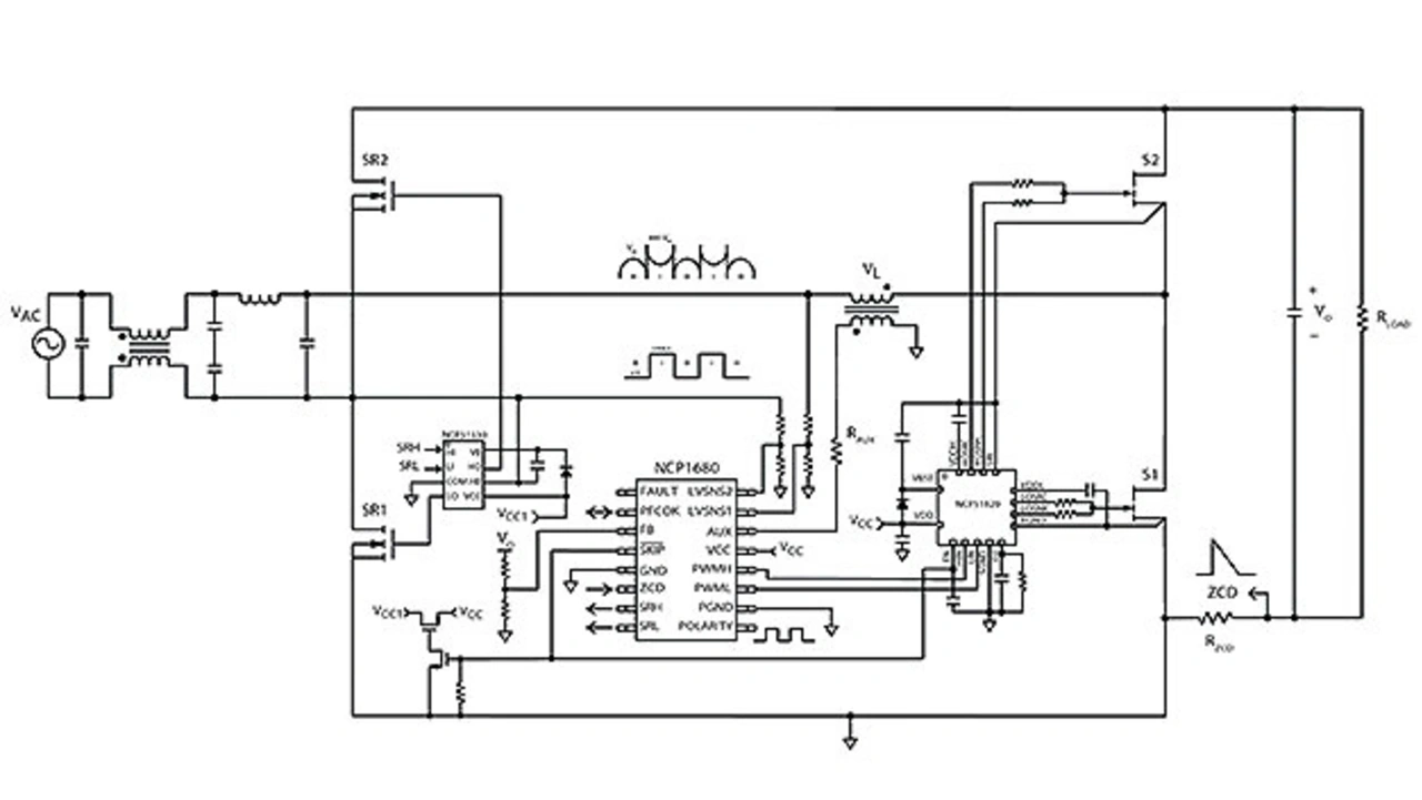 Um diese Herausforderungen zu lösen, können Entwickler den Mischsignal-Controller NCP1680ABD1R2G von Onsemi einsetzen (Bild 3), der eine integrierte und codefreie Totem-Pole-PFC-Lösung für den CrCM bietet (Bild 4, rechts). Der Controller im SOIC-16-Gehäuse ist nach AEC-Q100 für Automobilanwendungen qualifiziert und verfügt über eine verlustarme, kosten- günstige Strommessung per Shunt und implementiert eine zyklusweise Strombegrenzung, ohne dass ein Hall-Effekt-Sensor erforderlich ist.
