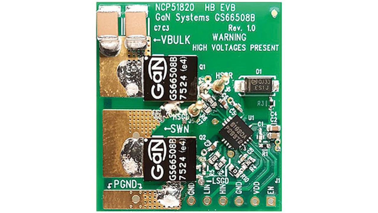 Um die Markteinführung zu beschleunigen, können Entwickler das Evaluierungsboard (EVB) NCP51820GAN1GEVB verwenden. Dieses hilft Entwicklern, die Leistung der Treiber zur effizienten Ansteuerung von zwei GaN-Leistungsschaltern in einer Totem-Pole-Konfiguration zu untersuchen. Es umfasst den GaN-Treiber NCP51820 und zwei selbstsperrende GaN-Leistungsschalter in einer Halbbrückenkonfiguration (Bild 5).
