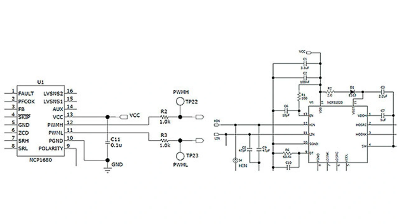 Es gibt einige einfache Punkte, damit Entwickler die beste Performance bei der Verwendung dieser ICs erzielen. Um beispielsweise zu verhindern, dass Rauschen in den Signalpfad einkoppelt und versehentlich den Gate-Treiber NCP51820 auslöst, empfiehlt Onsemi, die Steuersignale (PWMH und PWML) vom NCP1680 direkt am Eingang des Gate-Treiber-ICs zu filtern. Ein Widerstand mit 1 kΩ und ein Kondensator mit 47 pF oder 100 pF, der direkt am Pin des Treibers platziert wird, können eine ausreichende Filterung gewährleisten (Bild 6).