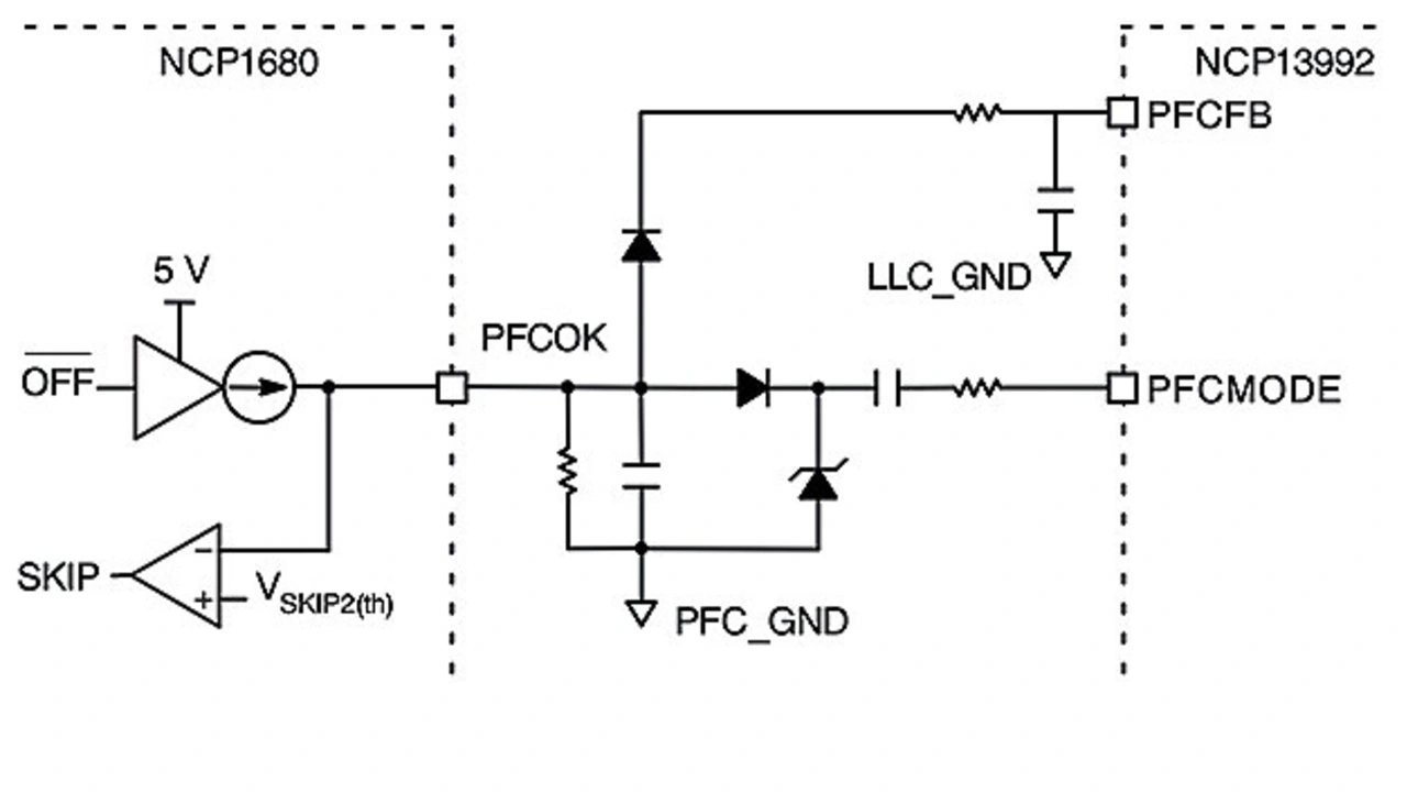 Der Pulse-Skipping- bzw. Stand-by-Modus des NCP1680 ermöglicht ein sehr gutes Verhalten im Leerlauf und bei niedriger Last. Allerdings muss er extern ausgelöst werden, indem der PFCOK-Pin gepulst oder der SKIP-Pin geerdet und mit dem Resonanzmodusregler NCP13992 verbunden wird (Bild 7). Die Komponentenwerte für die Schnittstellenschaltung sollten denen für das Evaluation-Board entsprechen. Im Normal-betrieb entspricht der PFCMODE-Pin des NCP13992 Resonanzmodusreglers der VCC-Bias-Spannung des Reglers. Er pulsiert gegen Masse, wenn der Wandler in den Skip-Modus übergeht. Um in den Skip-Modus zu gelangen, muss der PFCOK-Pin für mehr als 50 μs unter 400 mV liegen.