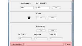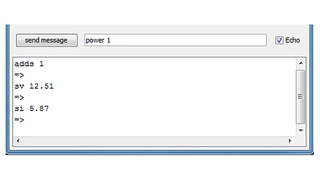 In dem rot markierten Bereich kann der Kommando-Text eingegeben werden. Es kann entweder mit der ENTER-Taste oder dem Drücken des Buttons „send message“ der Befehl gesendet werden. Möchte man zusätzlich noch eingegebene Befehle mitgeloggt haben, kann ein Häkchen im Kontrollkästchen „Echo“ gesetzt werden. Das Textfeld unterhalb ist dafür vorgesehen um die Antwort des ausgewählten Netzteils darzustellen (Bild 13). Ist ein bestimmtes Netzteil einzustellen muss man dieses zuerst adressieren. Hierfür ist der Befehl ADDS x einzugeben, wobei anstelle von x die jeweils eingestellte Adresse des Netzteils einzugeben ist.