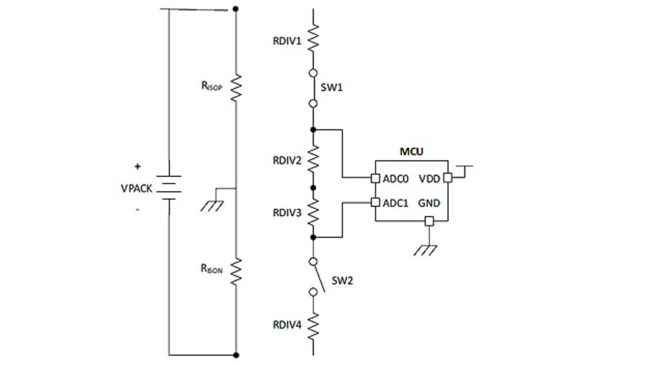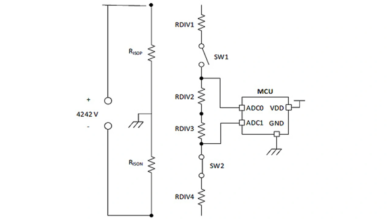 Die Isolationsüberwachung, bei der es auch um das Aufdecken von Erdungsfehlern gehen kann, ermittelt die Intaktheit der Isolierung zwischen Hochspannung führenden Leitern und dem Schutzleiter bzw. der Masse. Eine mögliche Konfiguration für die Isolationsüberwachung ist in Bild 1 zu sehen. Die grundlegende Funktionsweise einer Isolationsüberwachung beruht darauf, dass definierte Widerstände (RDIV1/2, RDIV3/4) zugeschaltet und bestimmte Berechnungen durchgeführt werden, um die unbekannten Isolationswiderstände (RISOP, RISON) zu ermitteln.