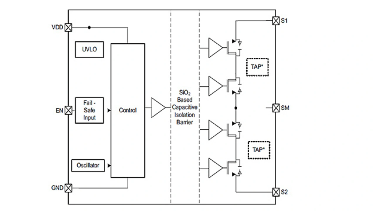 Photorelais sind grundsätzlich geeignet, allerdings ist zu beachten, dass sie bezüglich des Avalanche-Stroms, der Geschwindigkeit, der Zuverlässigkeit und der Lösungsabmessungen gegenüber Halbleiterrelais im Nachteil sind. Zum Beispiel unterstützt das Halbleiterrelais TPSI2140-Q1 (Blockschaltbild in Bild 3) einen Avalanche-Strom bis zu 2 mA, während es bei einem herkömmlichen Photorelais nur 0,6 mA sind. Durch seine LED und seine Vorspannungsanforderungen ist ein typisches Photorelais darüber hinaus auch in seiner Schaltgeschwindigkeit begrenzt. Hinzu kommen bei Photorelais die Alterungseffekte der photonischen Komponenten und der vermehrte Platzbedarf, da für die Treiberschaltungen zusätzliche Bauelemente benötigt werden.