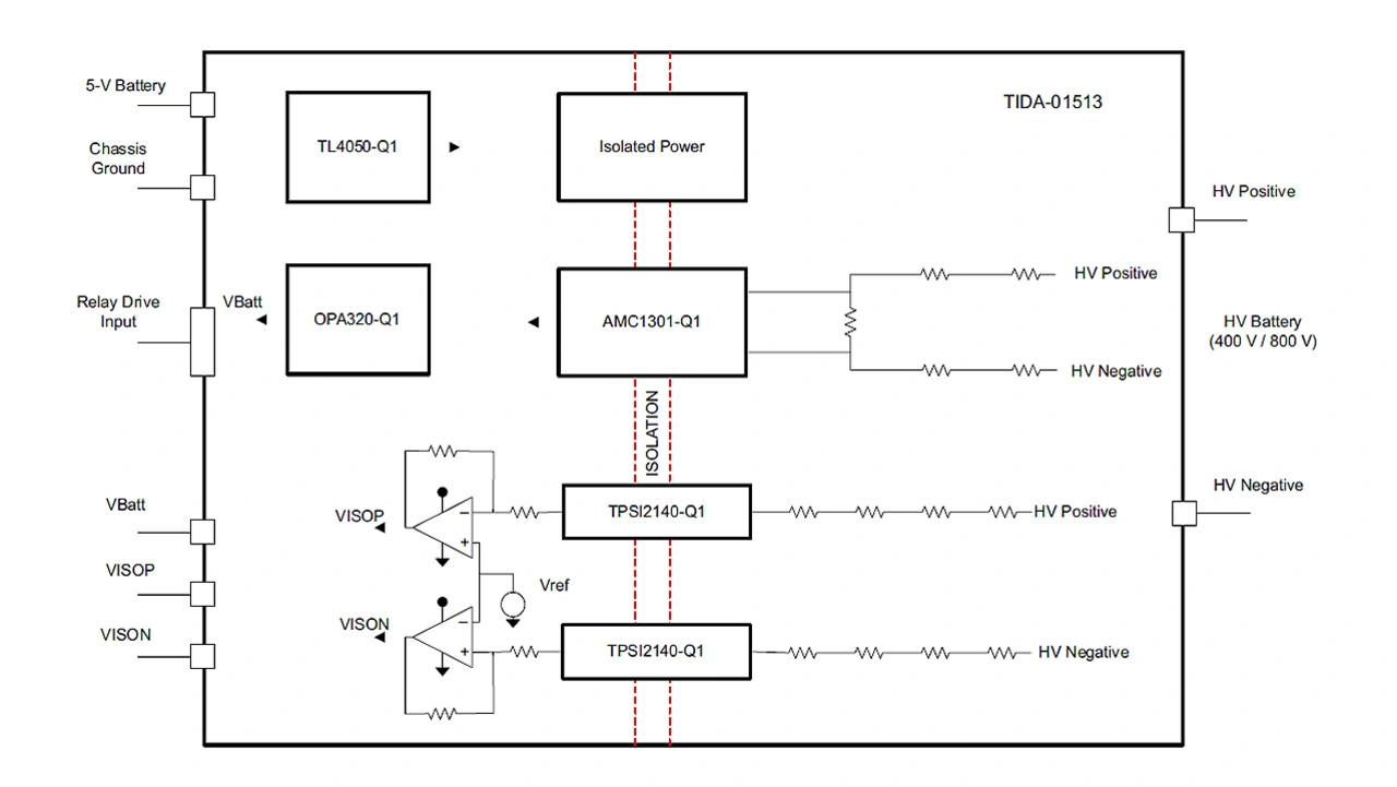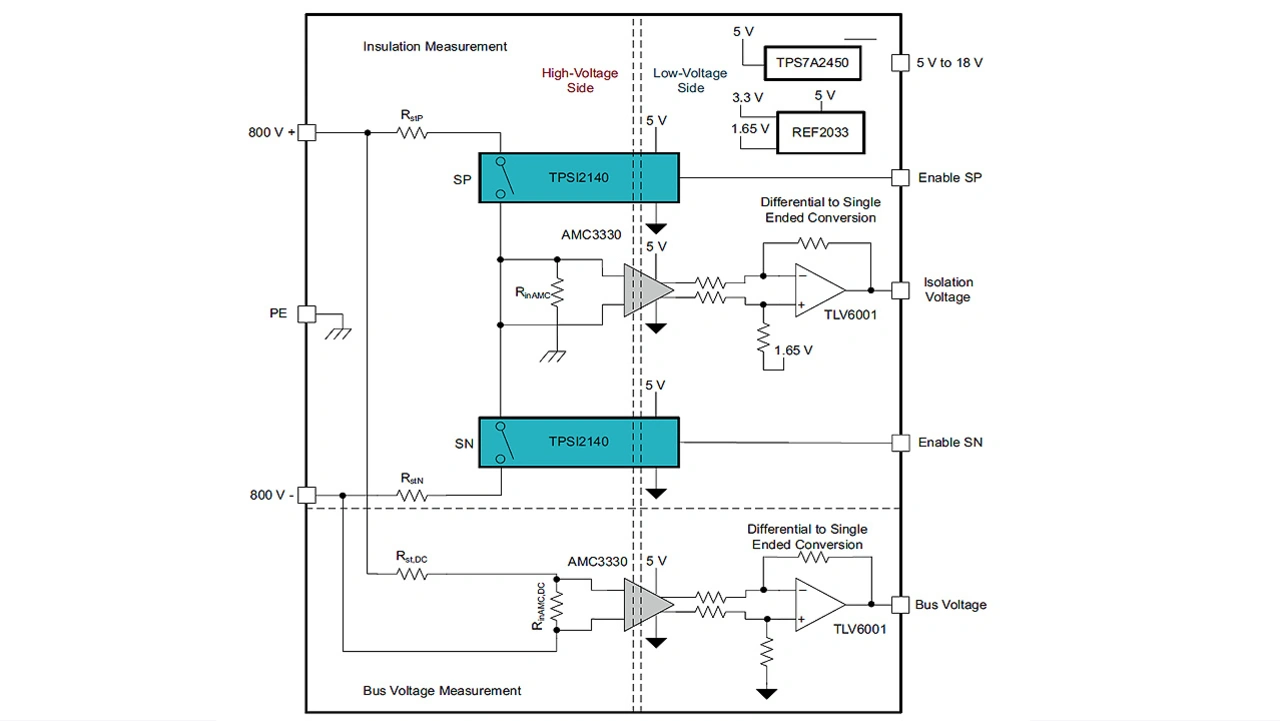 In einem Referenzdesign für ein Isolationsüberwachungs-AFE (AFE for Insulation Monitoring in High-Voltage EV Charging and Solar Energy Reference Design) und einem weiteren Referenzdesign für den Automotive-Bereich (Automotive High-Voltage and Isolation Leakage Measurements Reference Design) kommt das Halbleiterrelais TPSI2140-Q1 für das Zuschalten definierter Widerstände zum Einsatz.