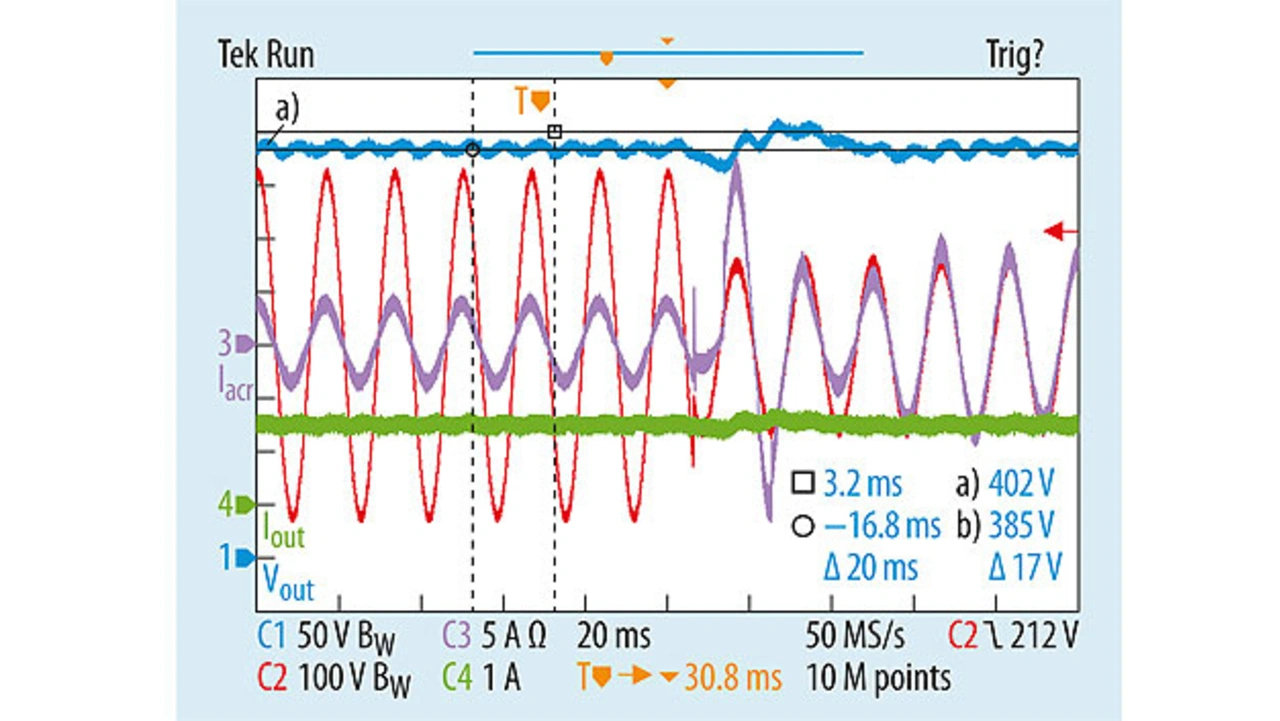 In Bild 1 ist ein Überstrom dargestellt, der während einer Netztransiente an einer PFC-Schaltung mit einer Leistung von 750 W auftrat. Während der Transiente steigt der Strom auf ungefähr das Dreifache des Werts, den er unter statischen Bedingungen hat.