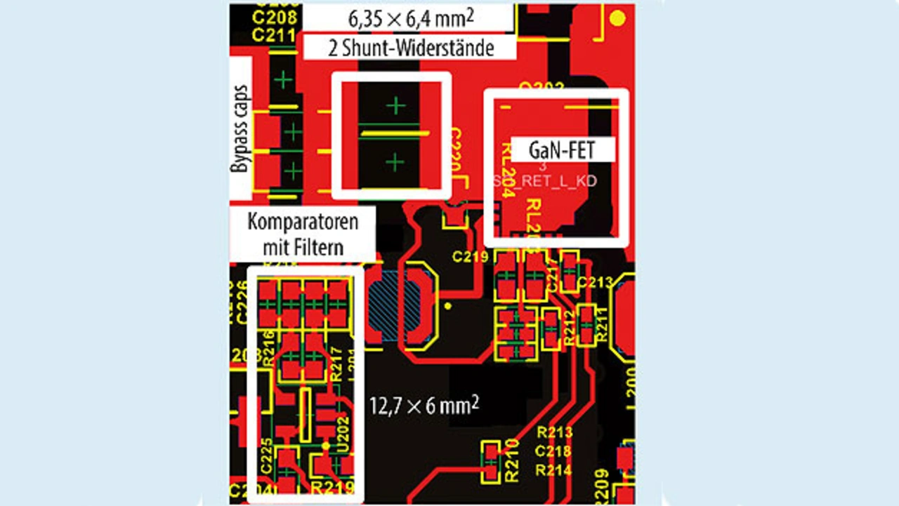 Wie bereits angesprochen, werden für jede OCP-Schaltung der Shunt-Widerstand selbst sowie eine Detektierungsschaltung mit einem schnellen Komparator und eine Austast-schaltung benötigt. Außerdem ist für den high-seitigen GaN-Baustein ein Pegelumsetzer nötig, um dem Controller den Fehlerzustand anzuzeigen. Ein exemplarisches Leiterplatten-Layout ist in Bild 3 zu sehen.