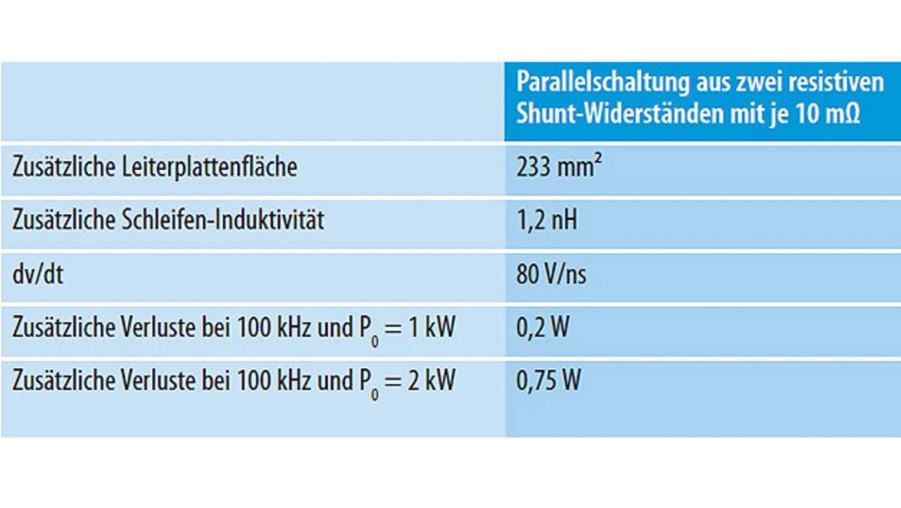 Hinzu kommt, dass der Shunt-Widerstand zum Einschaltwiderstand des GaN-FET addiert werden muss. Beide Komplikationen auf Systemebene haben vermehrte Verluste im System zur Folge. Bei einem mit 100 kHz schaltenden Wandler bewirkt ein Abtastwiderstand von 5 mΩ in einem System mit 1 kW Leistung einen Verlust von 0,2 W, während es bei einer Ausgangsleistung von 2 kW bereits 0,75 W sind. Außerdem erhöht sich die Leiterplattenfläche durch die Schaltung um 233 mm². Tabelle 2 fasst die Auswirkungen einer diskreten Lösung auf das Gesamtsystem zusammen.