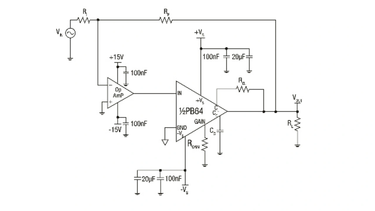 Für die zweite Option werden Operationsverstärker verwendet, die speziell für den Betrieb mit hohen Spannungen entwickelt wurden. Aufgrund von Beschränkungen des Halbleiterprozesses handelt es sich hierbei allerdings nicht um monolithisch integrierte Bauteile, sondern um kleine Module, die aber als Einzelkomponenten verwendet werden können. Diese Komponenten werden häufig zusammen mit einem kleineren Niederspannungs-OPV verwendet, der primär als Signalpuffer fungiert.