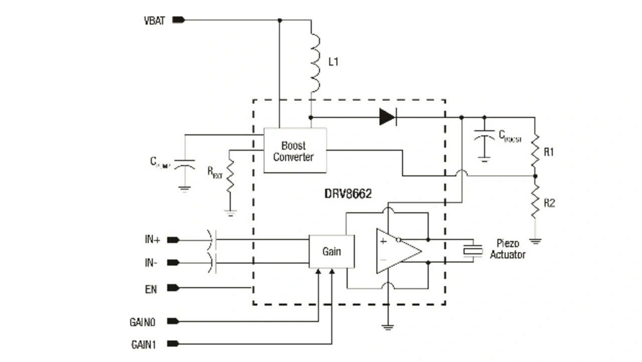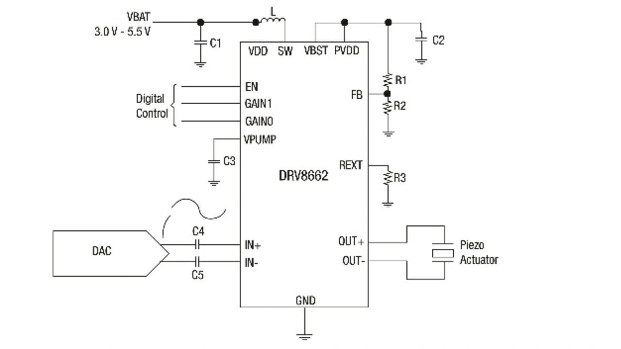 Texas Instruments beispielsweise hat mit dem DRV8662 einen haptischen Piezotreiber im Angebot, der bei einer Stromversorgung mit 3,0 V bis 5,5 V eine Last von 100 nF mit bis zu ±200 V versorgen kann (Bild 7) (bei geringerer Schwingung sind sogar noch höhere kapazitive Lasten möglich) . Dieses IC erfordert nur wenige externe passive Komponenten und unterstützt vier GPIO-gesteuerte Verstärkungen von 28,8 dB, 34,8 dB, 38,4 dB und 40,7 dB. Trotz seiner Nennspannung von ±200 V ist er in einem nur 4 mm × 4 mm × 0,9 mm großen QFN-Gehäuse untergebracht. Damit ist es gut für tragbare Anwendungen geeignet, bei denen die Größe eine Rolle spielt und die verfügbare DC-Spannungsschiene nur wenige Volt liefert. In einer einfachen haptischen Anwendung mit einem Piezowandler als Aktuator könnte das Treibersignal über einen D/A-Wandler (DAC) eingestellt werden, der wiederum von einem Prozessor gesteuert wird (Bild 8).