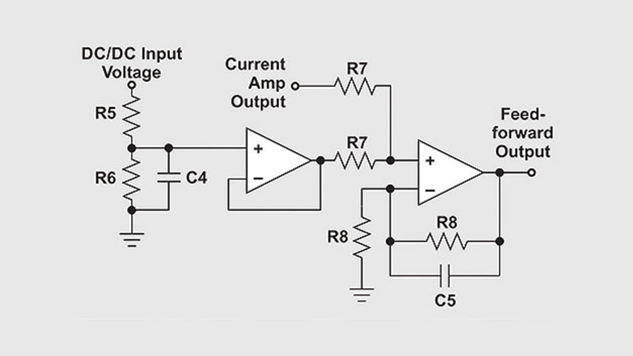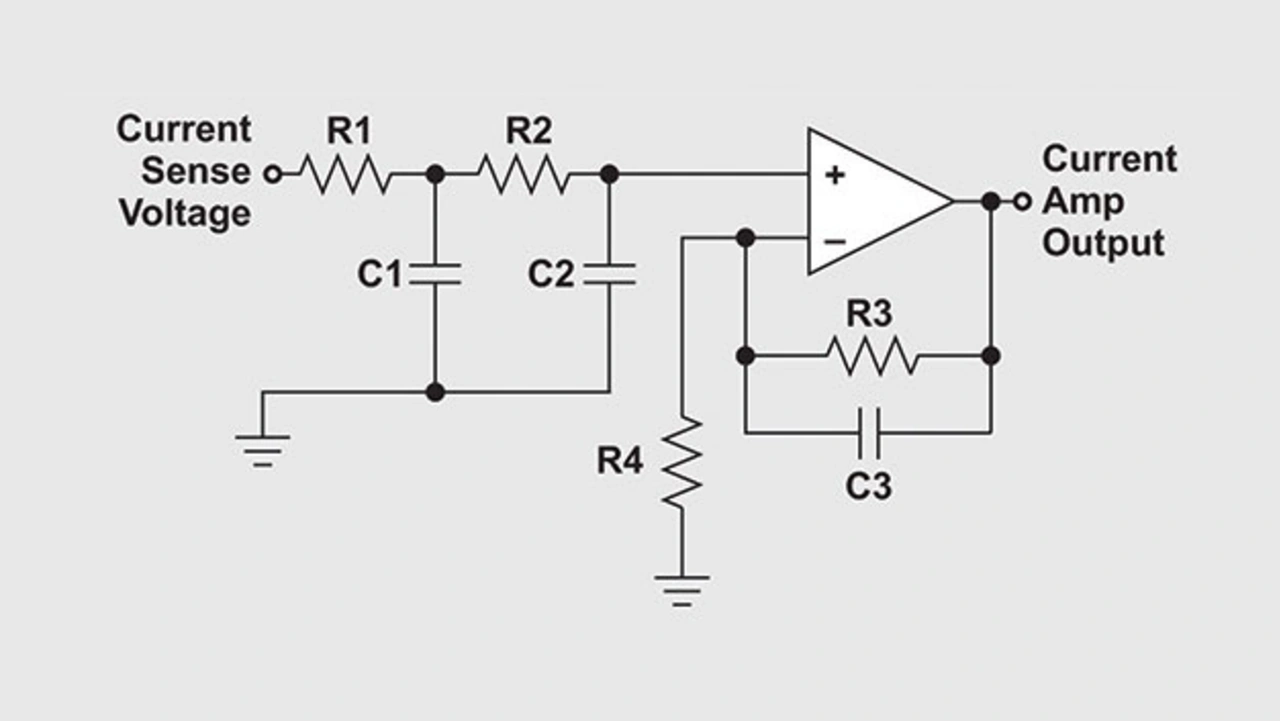 Bild 5 zeigt einen nicht-invertierenden Verstärker, der den Schaltstrom am Messwiderstand eines stromgeregelten Gleichspannungswandlers erfasst und dessen durchschnittlichen Primärstrom ausgibt. Da dieser Strom geschaltet wird, ist der Eingang des Stromverstärkers mit einem Tiefpassfilter versehen. Durch den Einsatz zweier RC-Filter lässt sich in der ersten Stufe das hochfrequente Rauschen entfernen, das sonst in die Mittelwertbildung der zweiten RC-Filterstufe eingehen würde. Der Verstärkungsfaktor des Verstärkers sollte abhängig von der erwarteten Spannung der Referenzschwelle und der hinzuaddierten Feed-Forward-Spannung variiert werden.