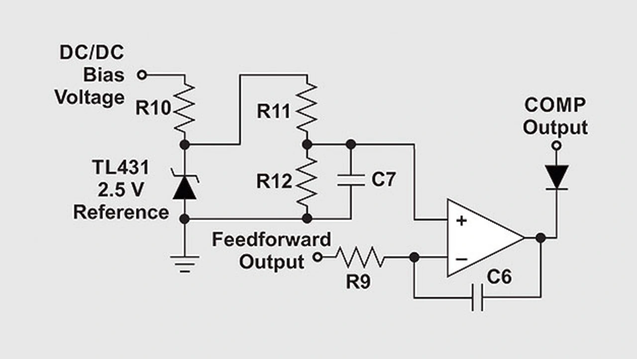 Die Norm IEEE 802.3bt erlaubt bis zu 100 m lange Cat5e-Kabel (Category 5 Ethernet). Dies bedeutet, dass die Spannung an einem PoE-PD und dem Gleichspannungswandler abhängig vom Leistungsniveau in einem weiten Bereich schwanken kann. Die Feed-Forward-Schaltung (Störgrößenaufschaltung) in Bild 6 minimiert den Einfluss der Eingangsspannung auf die Leistungsbegrenzung eines Gleichspannungswandlers.