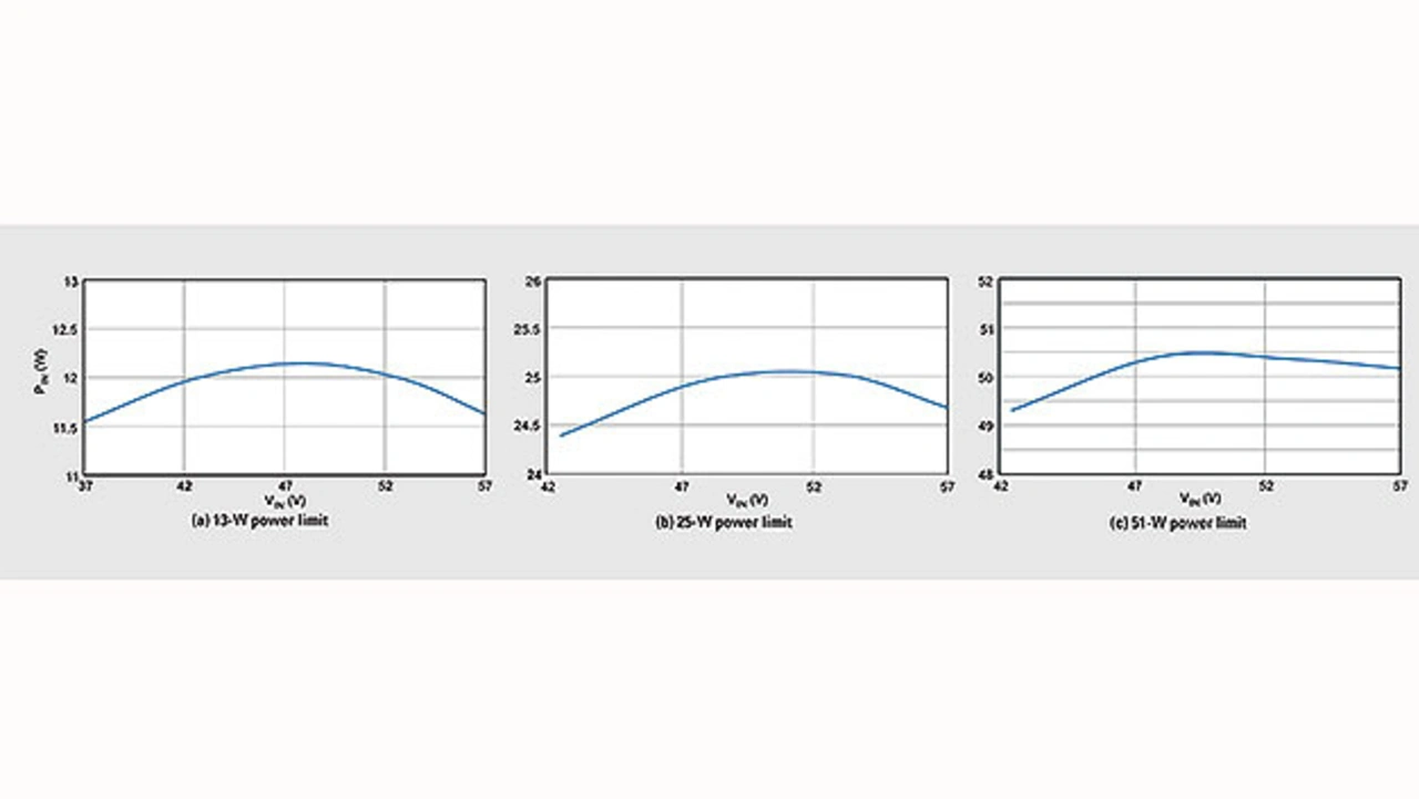 Die Aufteilung ist hier kleiner als 60:40, jedoch gibt der Wandler mit dem höheren Anteil weiter Leistung ab, bis er seine Leistungsgrenze erreicht. An diesem Punkt gibt der Wandler mit dem geringeren Anteil weiter seine begrenzte Leistung ab. Diese leistungsbegrenzte Aufteilung macht die Verwendung kostspieliger Current-Sharing-Controller überflüssig. Der maximale, unter den Wandlern aufgeteilte Ausgangsstrom wird nicht durch die Genauigkeit der Stromaufteilung eingeschränkt und ist auch unabhängig vom Wirkungsgrad der beteiligten Wandler, da die Leistung nicht am Ausgang, sondern am Eingang des jeweiligen Wandlers erfasst wird.