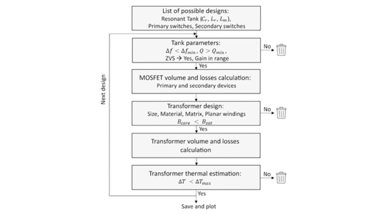 GAIA Converter und die Universidad Politécnica de Madrid entwickelten einen komplexen, interaktiven Entwurfsalgorithmus, um optimale Ergebnisse zu erzielen, wie in Bild 3 zusammengefasst. Das endgültige Design wurde mit fres1 bei 830 kHz, n = 4, Lr = 2,4 µH, Lm = 3 µH und Cr = 15,6 nF festgelegt, und auf der APEC 2022 wurde ein Papier mit den vollständigen Berechnungsdetails vorgestellt. Um die technischen Spezifikationen des Wandlers zu erfüllen, müssen Lr und Lm ähnliche Werte haben. Daraus ergibt sich die Schlussfolgerung, dass Lr nicht aus der absichtlich eingebrachten Streuinduktivität des Transformators gebildet werden kann, da dies die Verluste erhöhen und die Kopplung in unzulässiger Weise verringern würde. Daher wurde ein separates diskretes Bauteil entwickelt. Auf der Primärseite wurden GaN-HEMT-Transistoren für die Schalter gewählt, da sie einen niedrigen Einschaltwiderstand, hohe Geschwindigkeit, niedrige Bauelementekapazitäten und eine niedrige Gate-Treiberleistung benötigen. Der Resonanzkondensator Cr wurde als Parallelkombination aus dielektrischen C0G-Keramiktypen gewählt, um Genauigkeit und Stabilität bei Spannung und Temperatur zu gewährleisten.