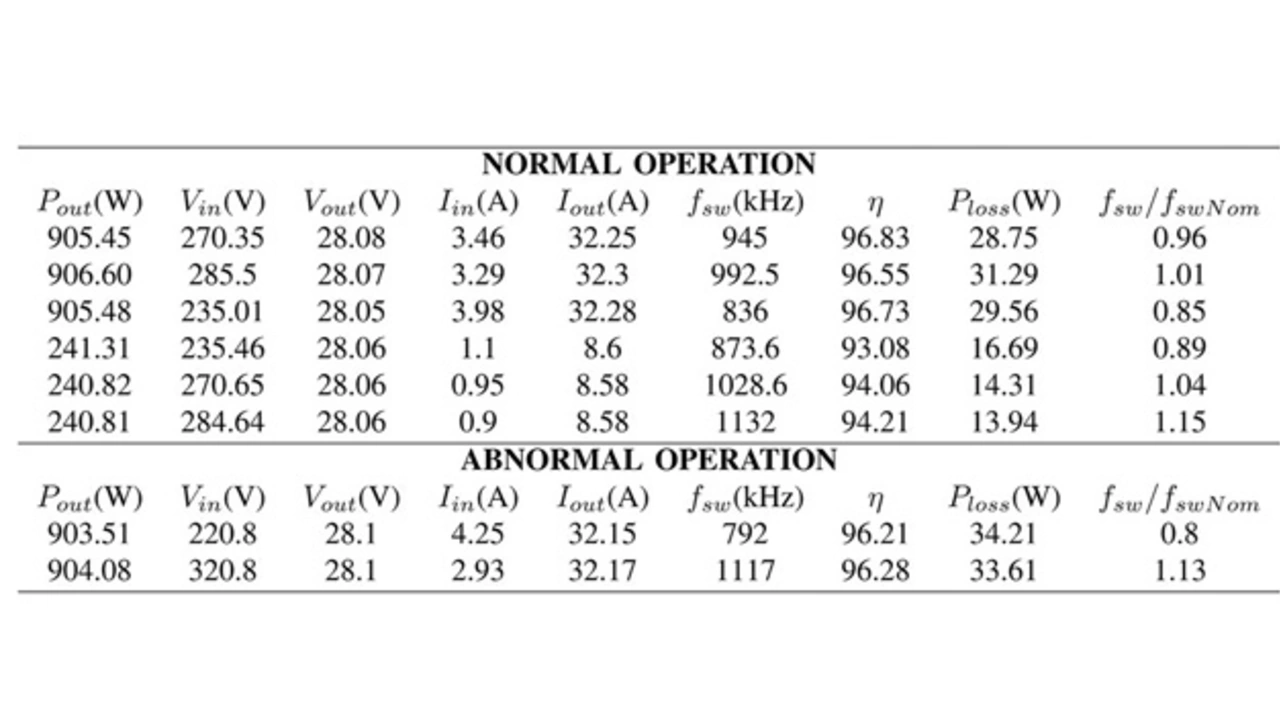 Zusammen mit dem entwickelten Entwurfsalgorithmus wurden Schaltungs-, Wärme- und EMI-Simulationen durchgeführt, die vielversprechende Ergebnisse lieferten. Es wurde ein Prototyp gebaut, der zeigte, dass der Wandler in das angegebene Volumen passt, und es wurden elektrische und thermische Tests durchgeführt. Es zeigte sich, dass der Temperaturanstieg des Transformators 30 K nicht übersteigt und die Zielwerte für den Wirkungsgrad erreicht wurden. Die kritische Spezifikation für die Frequenzschwankung von maximal ±15 Prozent wurde eingehalten und eine endgültige Leistungsdichte von 32 kW/dm3 erreicht. Die Ergebnisse sind in der Tabelle zusammengefasst.