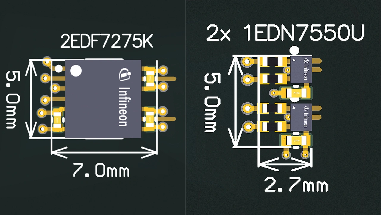 Da es sich bei dem 1EDN7550U um einen einkanaligen Baustein handelt, lassen sie sich in diesem Fall flexibler platzieren. Für den Entwickler ergibt sich dadurch ein weiterer Freiheitsgrad, wobei die Hardware anschließend entsprechend der Flächenbelegung, der Treiberschleife oder beidem optimiert werden kann.
