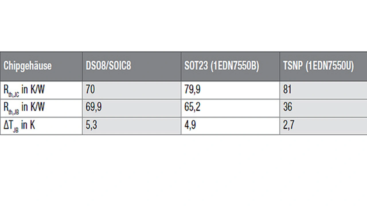 Um eine niedrige Sperrschichttemperatur TJ für die Gate-Treiber-ICs zu erreichen, muss der thermische Widerstand zwischen Sperrschicht und Leiterplatte Rth,JB möglichst niedrig sein, um eine möglichst niedrige Temperaturdifferenz zur Platine ΔTJB zu erreichen. Dies gelingt durch die hohe thermische Performance des TSNP-Gehäuses (Tabelle 2).