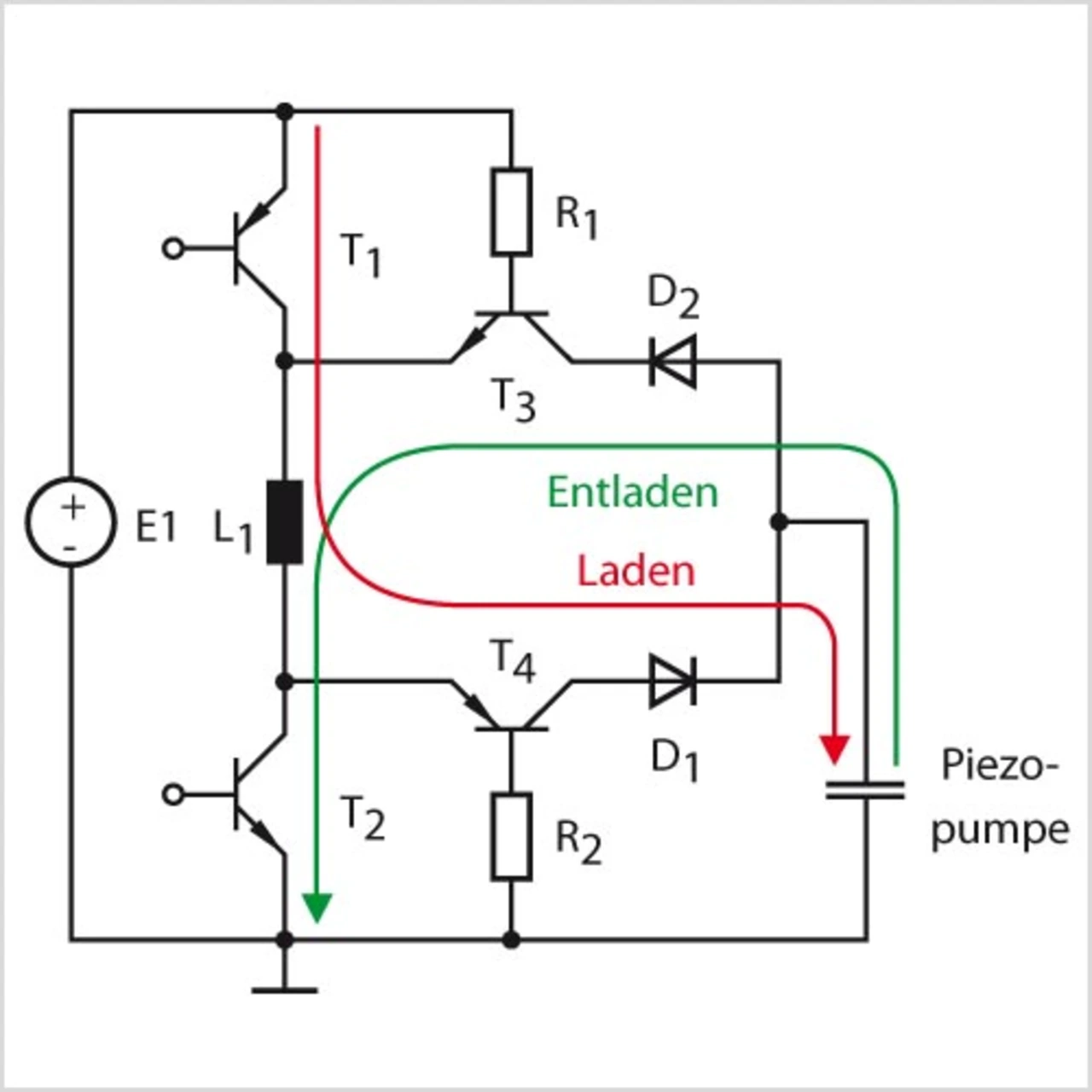 Das Fraunhofer-Institut für Zuverlässigkeit und Mikrointegration (IZM, www.izm.fhg.de) in Berlin hat eine Elektronik zur Ansteuerung von kapazitiven Lasten entworfen. Die Elektronik für eine Piezopumpe aus Steuerung und Stromversorgung sollte dabei zusammen mit der Pumpe das Volumen von 7 × 7 × 7 mm³ nicht überscheiten. Der DC/AC-Wandler muss, für den Einsatz in mobilen Geräten, aus einer Eingangsspannung von 3,7 V eine Ausgangs-Wechselspannung (80 Hz) von max. 140 Vss abgegeben. Die Anforderungen hinsichtlich Übersetzungsverhältnis und Volumen schränken die Wahl der möglichen Schaltungen stark ein. Der gewünschte Wechselrichter ließ sich nur durch den Entwurf einer neuen Schaltung für DC/AC-Wandler realisieren: die Verheiratung von Hoch- und Tiefsetzsteller. Hochsetzsteller und Wechselrichter arbeiten mit einer gemeinsamen Induktivität und werden abwechselnd betrieben. In einer Halbperiode lädt der Hochsetzsteller die kapazitive Last auf die max. Spannung auf, während der Wechselrichter „ruht“. In der zweiten Halbperiode „ruht“ der Hochsetzsteller, während der Wechselrichter das Ausgangspotential schrittweise absenkt, die Kapazität entlädt. Die selbst schaltenden Transistoren T3 und T4 dienen dabei der Entkopplung der beiden Schaltungsteile. Dabei übernimmt ein Mikrocontroller die Ansteuerung der Transistoren T1 und T2, die Erzeugung der Schaltfrequenz, Pumpfrequenz sowie die Regelung der Spannungsamplituden durch einen einfachen Zweipunktregler. Insgesamt besteht die Schaltung nur aus dem Controller, sechs Halbleitern sowie wenigen passiven Bauteilen.