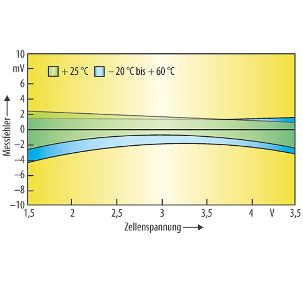 Der Verlauf der Entladekurve zeigt die in einer Zelle gespeicherte Ladung. Deshalb hat die Messgenauigkeit hier einen direkten Einfluss auf die Genauigkeit der Ermittlung der aktuellen Reichweite des Fahrzeugs. So kann z.B. eine Lithium-Ionen-Phosphat-Zelle in der Mitte ihrer Entladekurve einen Spannungsrückgang von nur 1 mV je Prozent der gesamten Ladung zeigen. Das bedingt eine Messgenauigkeit von ±2 mV, um die gesamte Ladung des Ladesystems auf 2 % genau zu berechnen (Bild 2).