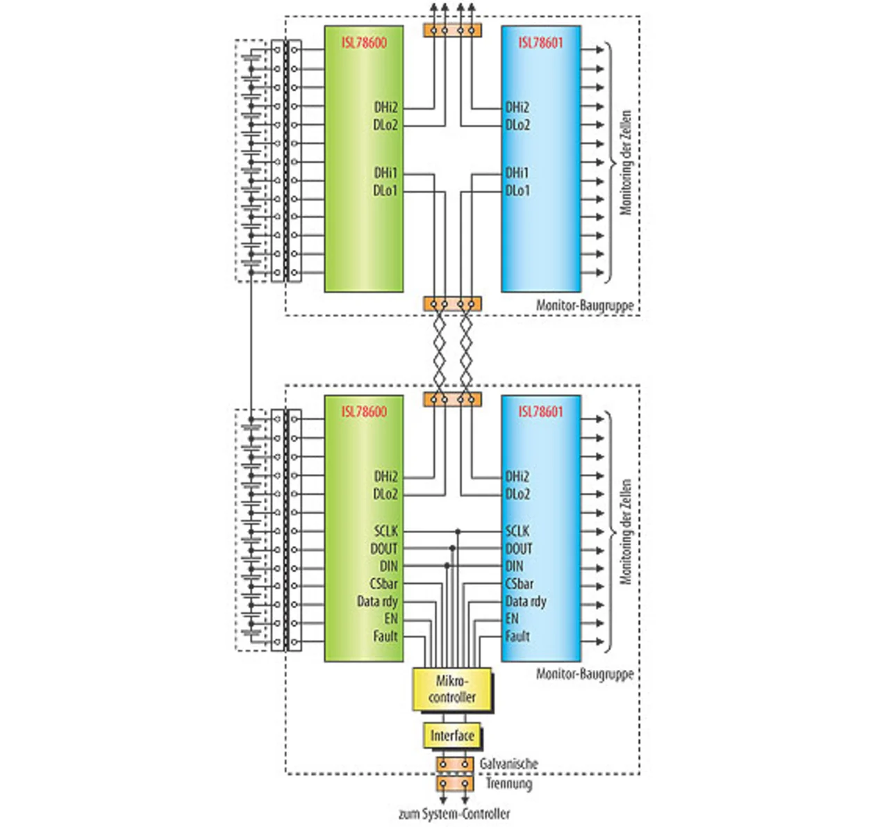 Da die Überwachungsschaltungen ihre Fehlermeldungen sowohl untereinander - zum Abschalten des gesamten Systems, falls nötig - als auch mit dem Mikrocontroller kommunizieren müssen, zählt die Kommunikation zu den kritischen Fähigkeiten des Akkumanagementsystems. Standard-CAN- oder SPI-Schnittstellen ermöglichen eine sichere Kommunikation mit dem Mikrocontroller. Doch die Verwendung einer solchen Schnittstelle zwischen allen Überwachungsschaltungen brächte einen unnötigen Aufwand. Ein CAN-Interface plus Isolator kostet einige US-Dollar pro Überwachungsschaltung. Ein speziell ausgelegtes Interface erledigt diese Aufgabe für einen Bruchteil dieses Betrags.