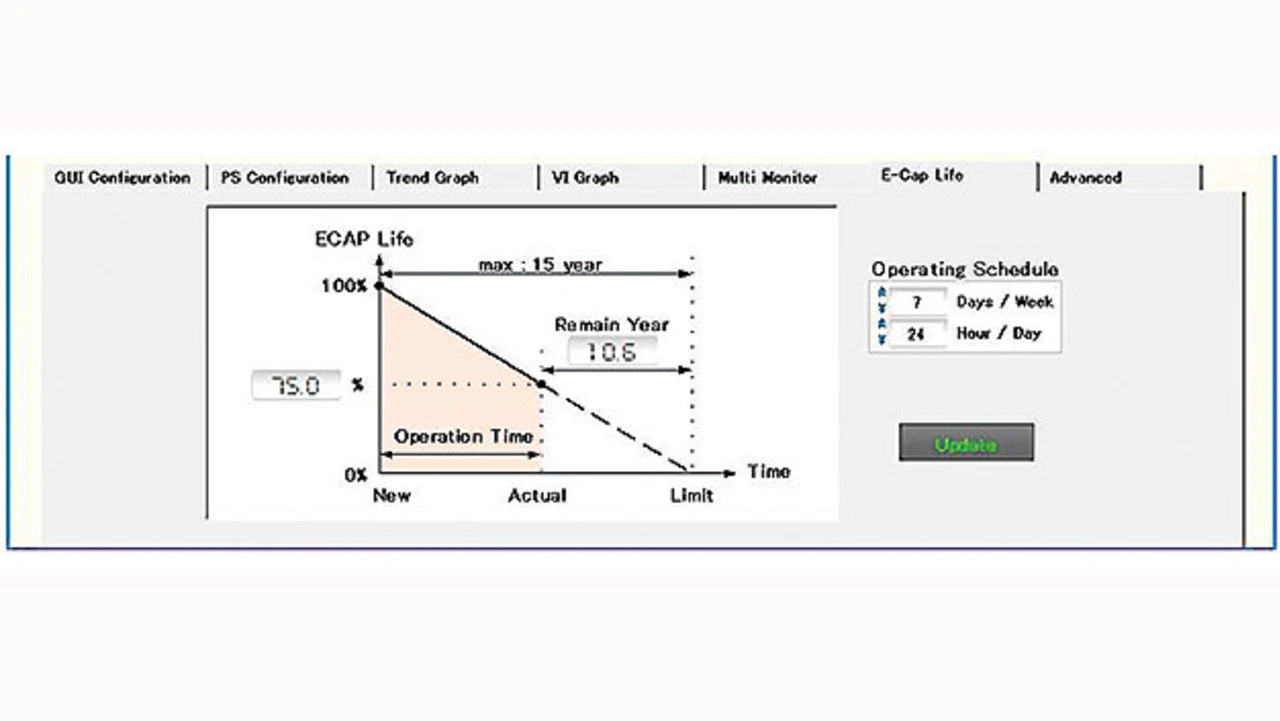 Zur Berechnung des Stresslevels und der Lebenserwartung kann die Historie von Temperatur, Betriebsdauer und Betriebszeiten im Überlastbereich ausgewertet werden. G-AXESS ermöglicht zudem die angepasste Anzeige der Ausgangskennlinien abhängig von Einbaulage und Umgebungstemperatur. Eine Punktanzeige visualisiert die aktuelle Belastung. Anhand des Betriebsstundenzählers und des Stresslevels lässt sich der Zeitpunkt zum Austausch des Netzteils vorhersagen. Zugrunde liegt die Faustregel, dass eine Temperaturerhöhung um zehn Grad die Lebensdauer der Elkos halbiert.