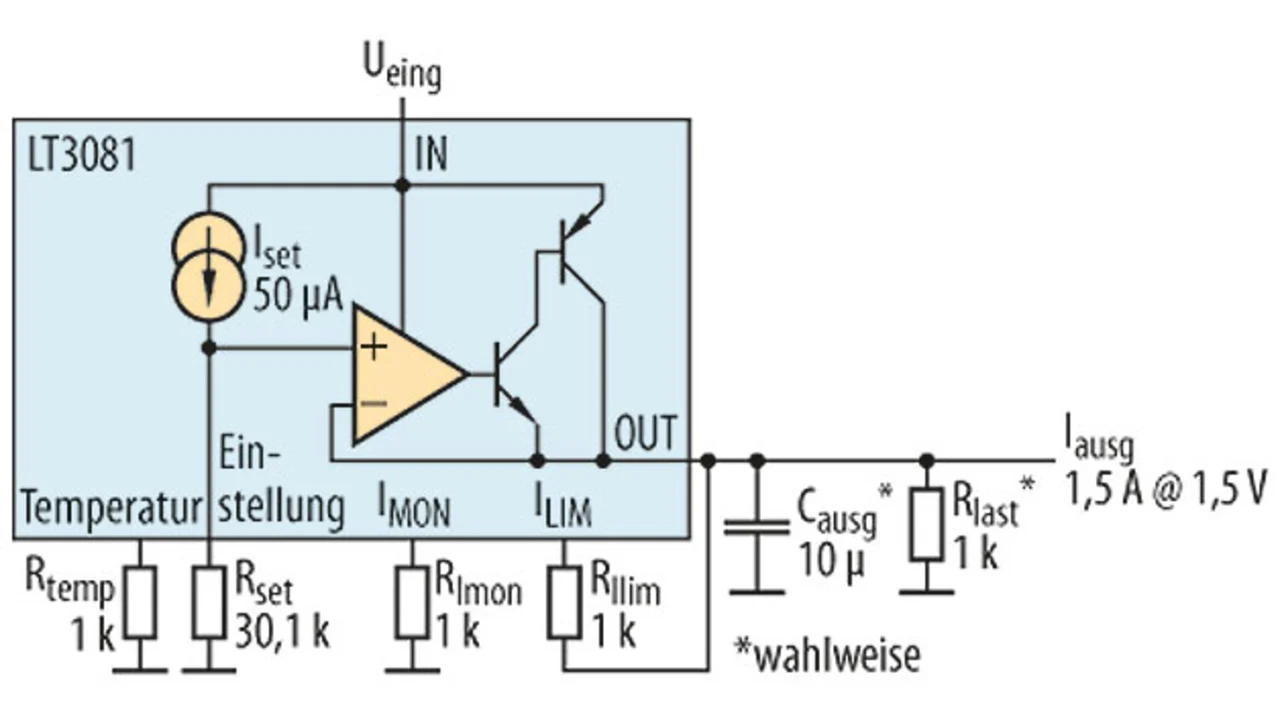 Der LT3081 ist ein Regler für industrielle Anwendungen; er zeichnet sich aus durch einen großen sicheren Arbeitsbereich (SOA – Safe Operation Area). Er liefert 1,5 A Ausgangsstrom, kann auf 0 V Ausgangsspannung eingestellt werden, ist eigensicher und bietet Monitor-Ausgänge für Temperatur und Ausgangsstrom. Zusätzlich kann die Strombegrenzung über externe Widerstände eingestellt werden. Bild 2 zeigt die interne Grundschaltung und die äußere Beschaltung des LT3081.