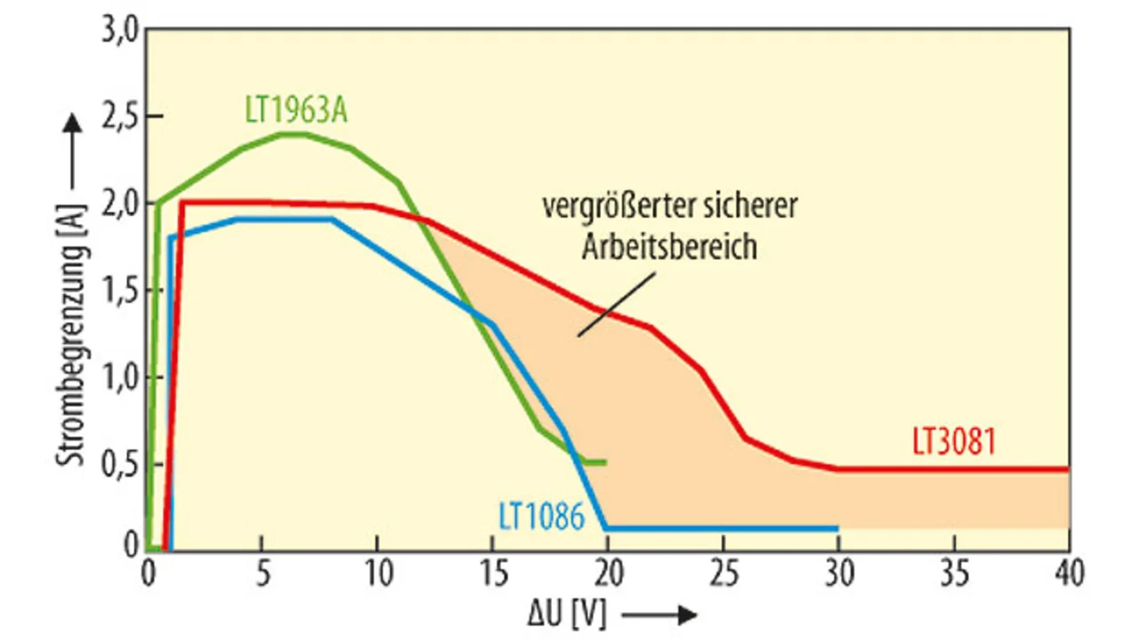 Der LT1963A ist ein LDO mit einem begrenzten SOA; Transienten am Eingang führen dazu, dass der Maximalstrom bei hoher Spannung (High Voltage Current Limit) überschritten wird. Der LT3081 dagegen bietet einen breiten SOA und noch nahezu 1 A Ausgangsstrom bei Spannungsdifferenzen bis zu 25 V. Bei noch höheren Spannungen ist sogar noch ein Ausgangstrom von 500 mA möglich. Ein breiter SOA wird durch eine große PNP-Struktur erzielt, außerdem ist der LT3081 zusammen mit der Last gegen Verpolung am Eingang geschützt.