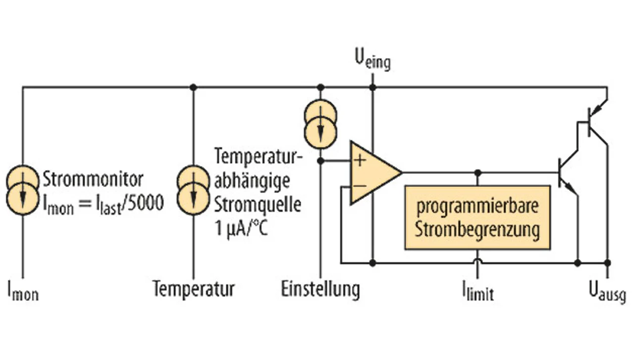 Für Temperatur- und Strom-Monitor-Ausgänge wurden Stromquellen verwendet, die in einem Bereich von –40 V bis +0,4 V bezogen auf den Ausgang und auch bei Kurzschluss am Ausgang arbeiten. Auf diese Weise funktioniert der Schaltkreis mit Eingangsspannungen Ueing zwischen 0,4 V über Uausg und 40 V unter Uausg. Der Temperaturausgang liefert 1 μA/°C und der Strom-Monitor liefert einen Wert von Iausg/5000. Die Stromquellen messen den Spannungsabfall des Quellenstromes über den auf Masse gelegten Widerstand RImon. Da der Dynamikbereich der Monitor-Ausgänge 0,4 V über den Ausgang reicht, können Temperatur und Strom weiterhin gemessen werden, selbst wenn dieser kurzgeschlossen oder auf Null gesetzt ist.
