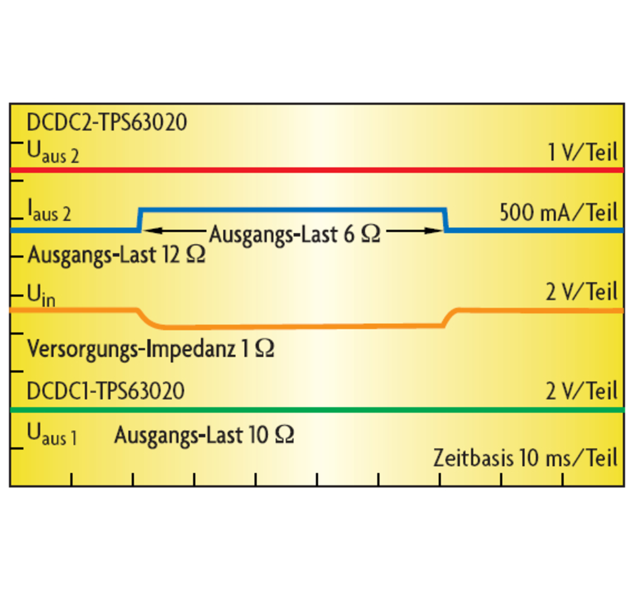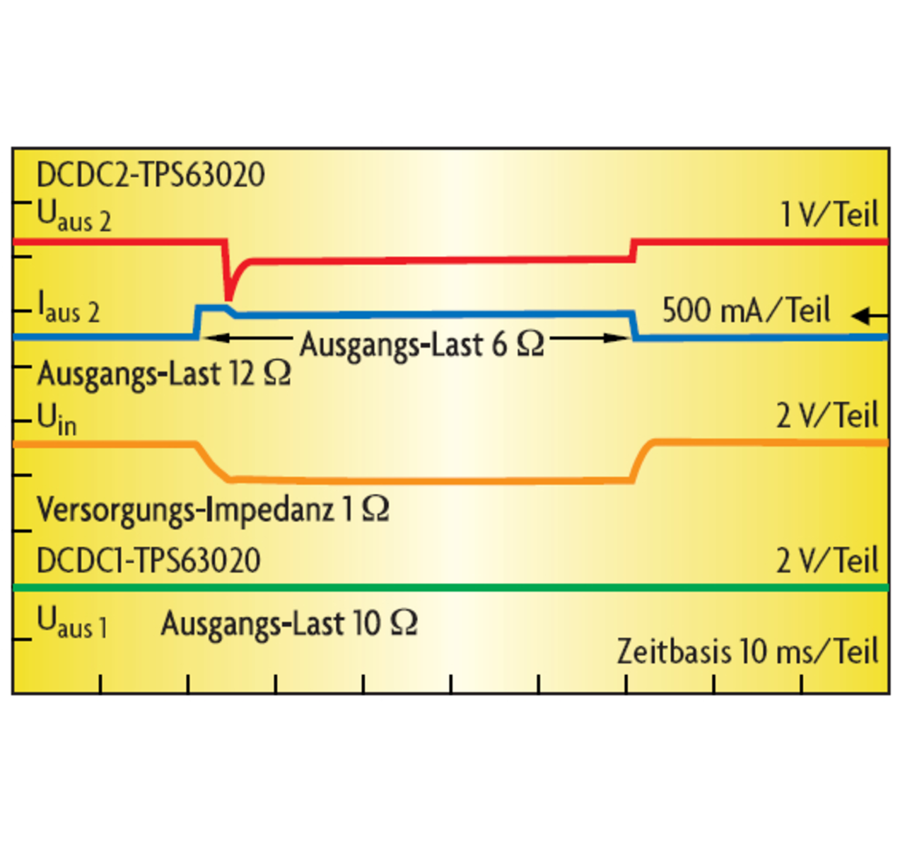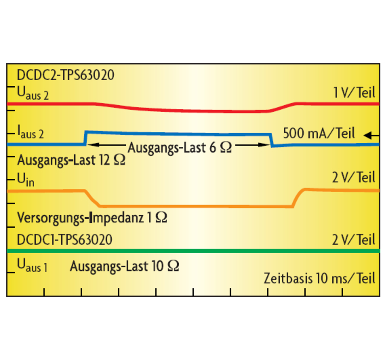 Um die Ausgangsspannung des DCDC2 bei dieser Lastschwankung weniger stark einbrechen zu lassen, kann dessen Ausgangskapazität vergrößert werden, um die während der höheren Last fehlende Energie zu speichern und bei Bedarf in die Last einspeisen. Dieses Verhalten ist in Bild 5 gezeigt. Ähnliche Probleme können auftreten, wenn DC/DC-Wandler eingeschaltet werden.