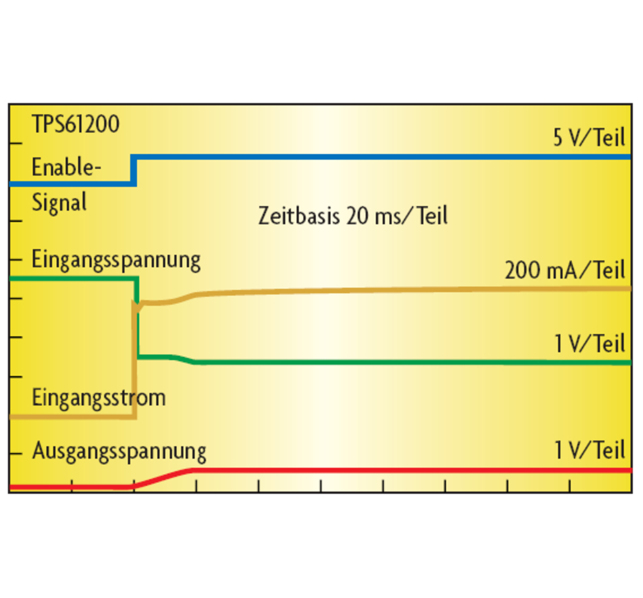 Bild 6 zeigt das Startverhalten eines Boost-Wandlers TPS61200, der auch bei sehr niedrigen Versorgungsspannungen arbeitet: Gleich nach dem Einschalten steigt der Eingangsstrom des Wandlers stark an. Der Wandler versucht damit, den Ausgangskondensator möglichst schnell aufzuladen.