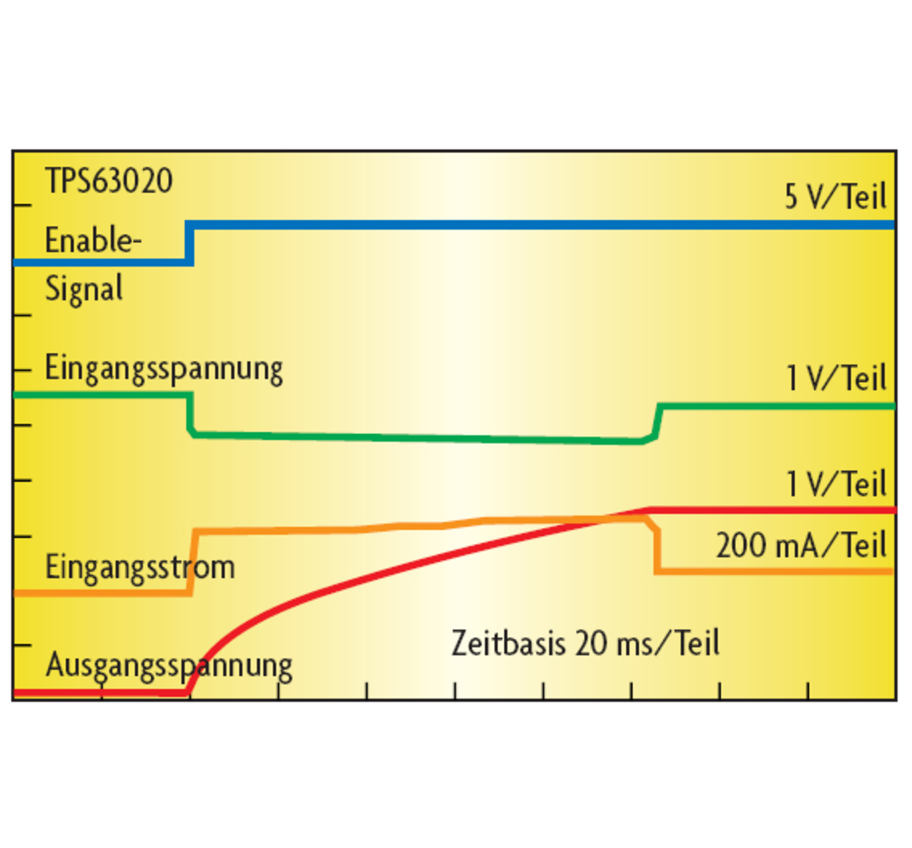 Wird der Eingangsstrom dagegen reduziert, ist unter gleichen Lastbedingungen ein Starten möglich. Bild 7 zeigt die entsprechenden Kurven für den TPS63020. Das Sinken der Versorgungsspannung bewirkt beim TPS63020, dass die Eingangsstrombegrenzung verringert wird, und sorgt damit dafür, dass auch die Versorgungsspannung nicht so stark fällt.