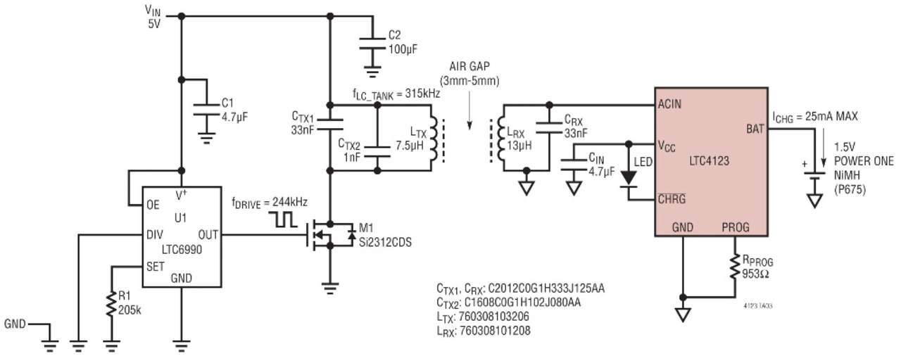 Der LTC4123 bildet in einem induktiv arbeitenden kontaktlosen Energieübertragungs-System die Basis für die Empfängerelektronik. Die Empfängerwicklung kann als Leiterbahnen auf der Leiterplatte der Empfängerelektronik realisiert werden (Bild 2). Ein externer, mit dem ACIN-Anschluss verbundener LC-Schwingkreis, erlaubt den resonanten Betrieb, um Leistung von einem magnetischen Wechselfeld, das von einer Sendewicklung erzeugt wird, zu empfangen. Für den Sender eignet sich z.B. ein spannungsgesteuerter Oszillator wie der LTC6990 (Bild 3).