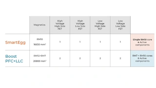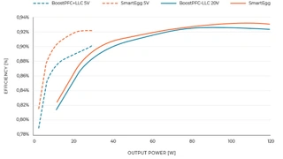 SmartEgg besteht aus einem eingangsseitigen Gleichrichter (Eggtronic bietet Lösungen an, die entweder auf einem Brückengleichrichter oder einem brückenlosen Gleichrichter basieren), zwei primären FETs, zwei sekundären FET-Gleichrichtern, einem einzigen magnetischen Bauteil und einigen Kondensatoren. Der Hauptcontroller verwaltet die PFC- und Ausgangsspannungsregelung, das ZVS und die Regelung der Schaltfrequenz.