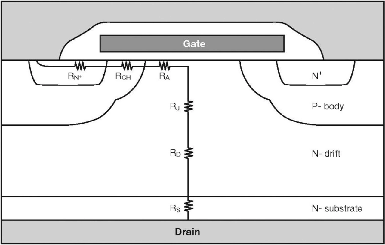 RON besteht aus mehreren Widerständen, die sich bei Reihenschaltung addieren. Die Faktoren reichen vom Widerstand des Diffusionsbereichs, des Kanalbereichs, des Akkumulationsbereichs und – am wichtigsten – des Driftbereichs. Weitere Faktoren sind der Kontaktwiderstand zwischen Drain- und Source-Metallisierung sowie der Bonddrahtkontakt auf dem Halbleiter und den Gehäuseanschlüssen. Der Wirkungsgrad lässt sich durch die Reduzierung der Leitungsverluste in jedem dieser Bereiche oder über das Leiterplattendesign erheblich verbessern.