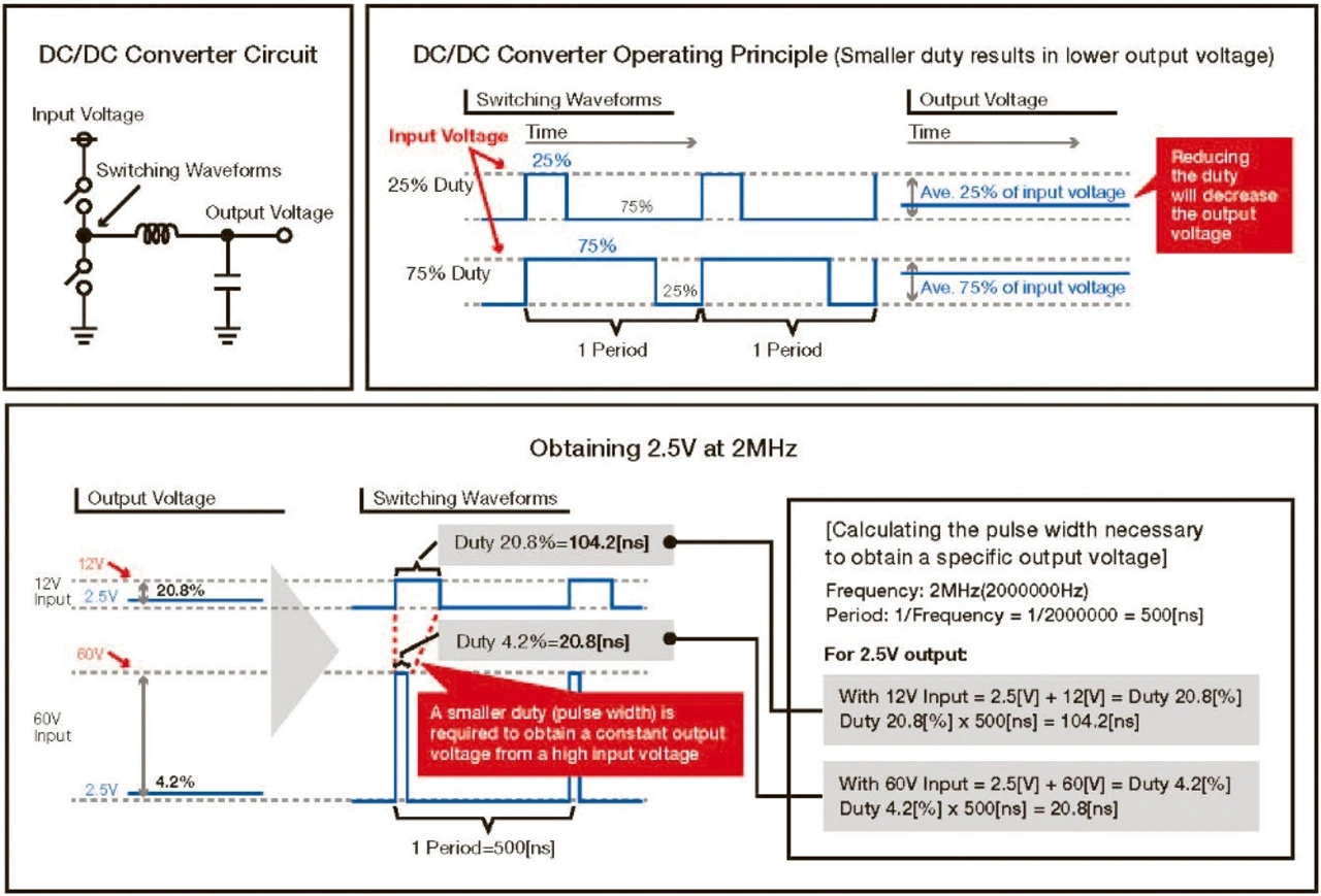 Eine technische Hürde, um bei hoher Frequenz aus einer höheren Eingangsspannung eine niedrigere Ausgangsspannung zu erreichen, ist die Verringerung der Schaltpulsbreite. Die Schaltpulsbreite eines DC/DC-Wandlers ist eine Funktion der Eingangsspannung, der Ausgangsspannung und der Schaltfrequenz und wird wie folgt berechnet: