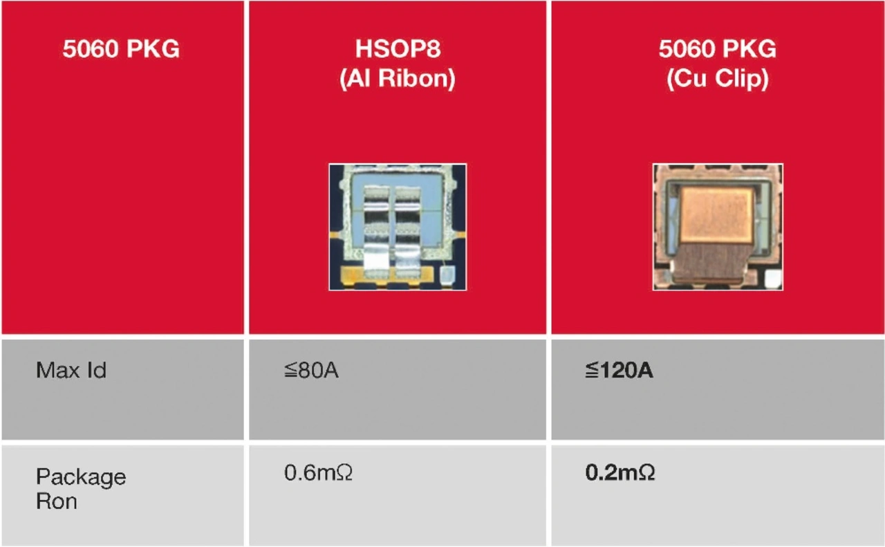 Der RON-Wert von MOSFETs ist einer der wichtigsten Faktoren, um den Wirkungsgrad von DC/DC-Wandlern zu verringern. Die Minimierung dieses Werts hat deshalb Priorität bei der Realisierung einer einstufigen Spannungswandlung. Eine Technologie zur Reduzierung des RON für Leistungs-MOSFETs sind Kupfer-Clips (Cu-Clips). Bei dieser Technologie wird eine massive Kupferbrücke zwischen der Oberfläche des Leistungshalbleiters und den Gehäuseanschlüssen verwendet. Die Vorteile der Kupfer-Clip-Technologie reichen von geringeren RON-Verlusten bis hin zu reduzierten induktiven Störeinflüssen auf den Zuleitungen.