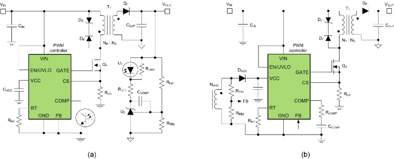 In Bild 1a ist ein herkömmlicher, sekundärseitig geregelter Sperrwandler (Secondary Side Regulation, SSR) zu sehen, in dem ein Optokoppler für die Isolation des Rückkopplungssignals sorgt. Bei den meisten Optokopplern kommt es allerdings zu Schwankungen des Gleichstrom-Übertragungsverhältnisses (Current Transfer Ratio, CTR) und die Lebensdauer sinkt bei hohen Temperaturen. Die CTR-Schwankungen sind eine ernste Einschränkung für Sperrwandler-Designs in industriellen Anwendungen, wo leicht Betriebstemperaturen bis zu 125 °C vorkommen. Außerdem entsteht durch den Optokoppler eine zusätzliche Polstelle im Rückkopplungskreis, welche die erzielbaren Einschwingeigenschaften einschränkt. Ein weiterer Nachteil ist, dass sich das Biasing und die Kompensation der Sekundärseite bei Ausgangsspannungen unter 3,3 V anspruchsvoll gestalten.