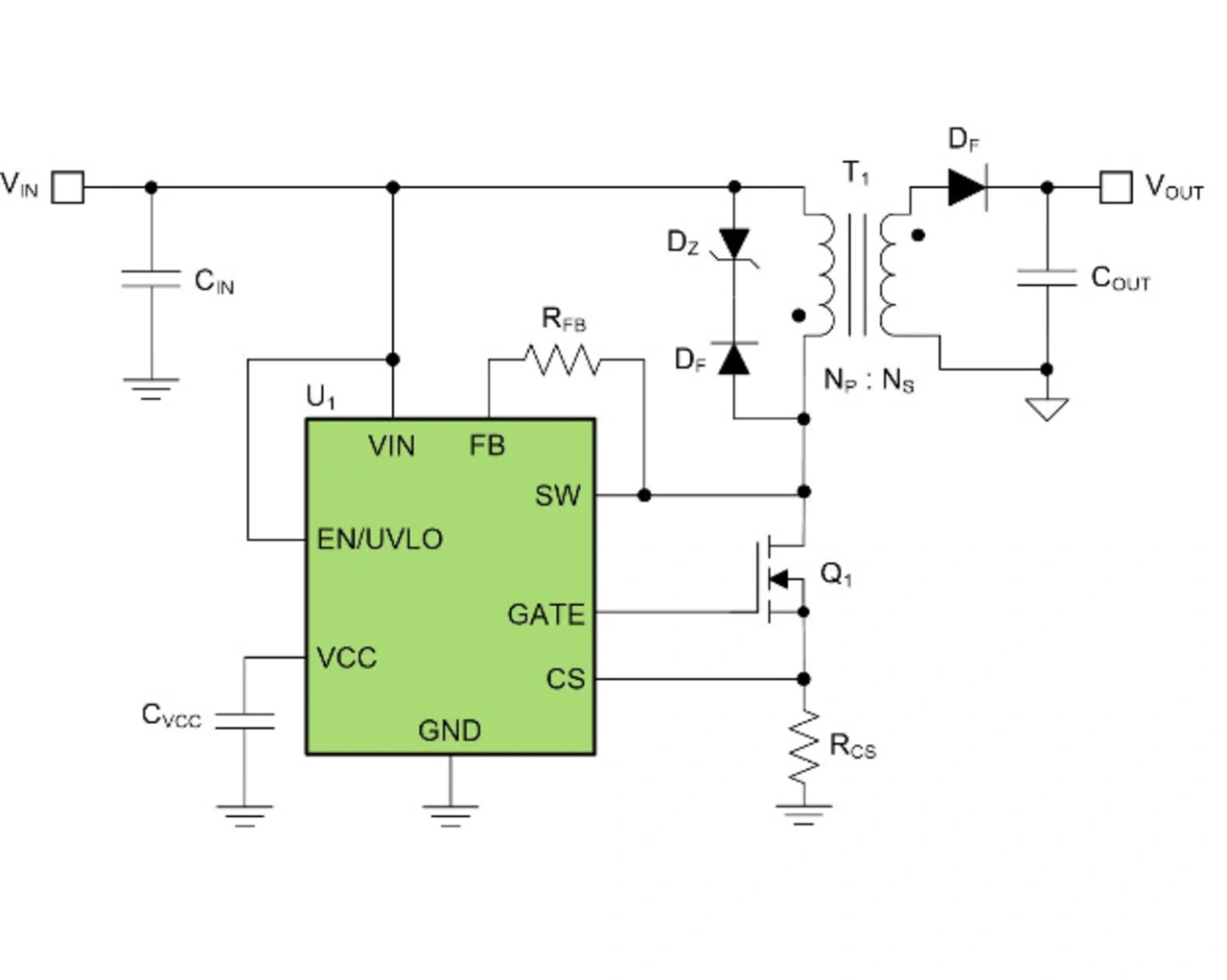 Das Schaltbild eines PSR-Sperrwandlers ohne Hilfswicklung ist in Bild 2 zu sehen. Ein Optokoppler wird ebenso wenig benötigt wie ein TL431-Regler oder eine Hilfswicklung am Übertrager zum Erfassen der Ausgangsspannung. Stattdessen wird die Spannung am Schaltknoten erfasst, bei der es sich um eine skalierte Version der Ausgangsspannung handelt, während der Leistungsschalter sperrt und die Freilaufdiode leitet. Mit Techniken zur Signalunterscheidung wird das Abtasten der Schaltknoten-Spannung am Ende der Leitphase der Diode (bzw. der Entmagnetisierung) gewährleistet, wenn der Strom in der Sekundärwicklung gegen null zurückgeht. Hierdurch werden Spannungsfehler vermieden, die in Zusammenhang mit dem Gleichstromwiderstand der Sekundärwicklung, der Streuinduktivität und dem dynamischen Widerstand der Diode stehen.